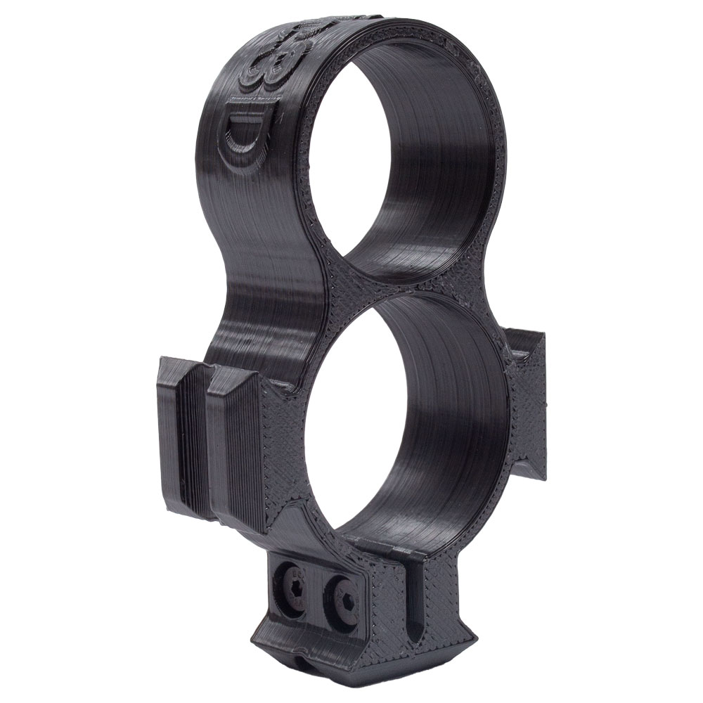 Esta peça é uma abraçadeira dupla (formato de "8") projetada para conectar o cano ao cilindro de ar da carabina. Sua função principal é dupla: estabilizar o conjunto cano/cilindro e, mais importante, adicionar trilhos táticos onde antes não existiam. Com os trilhos Picatinny laterais integrados, você ganha a liberdade de acoplar acessórios como bipés para tiros de precisão apoiados, lanternas para caça noturna ou lasers para visada rápida, tudo isso sem precisar furar a coronha ou fazer adaptações gambiarras.