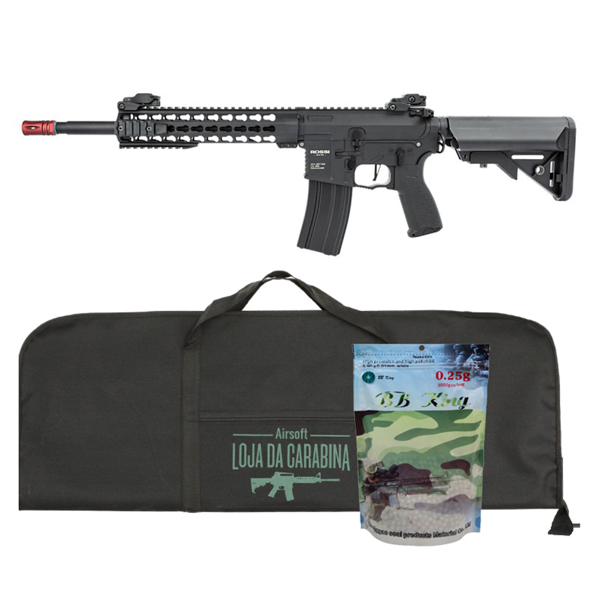 A LojaDaCarabina indica o uso de BBs 0.25g para explorar ainda mais o desempenho desse Rifle Rossi AR15.
