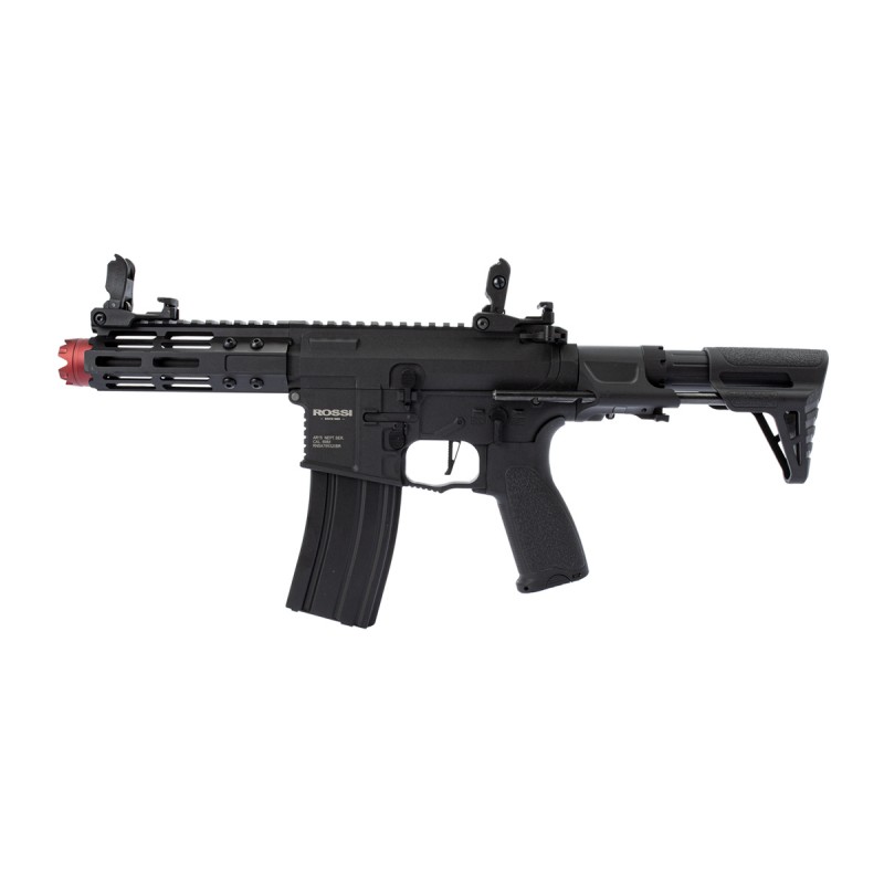 Corpo muito resistente em nylon com partes em metal. Coronha retrátil oferecendo firmeza e conforto ao atirador.