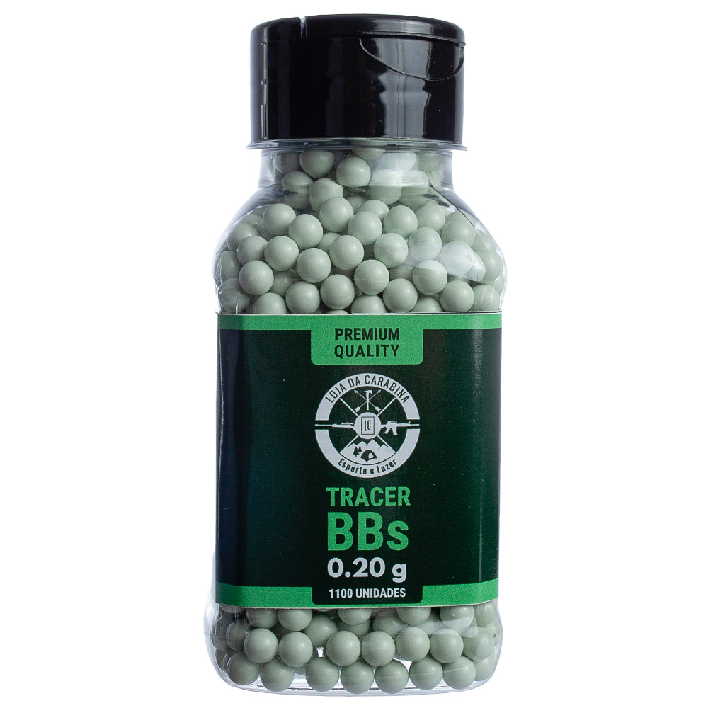 BBs tracer são esferas com material fosforescente ou revestimento que brilham temporariamente após serem carregadas por uma fonte de luz (LED UV/laser do módulo tracer), permitindo ver a trajetória do tiro no escuro ou em baixa luminosidade.
