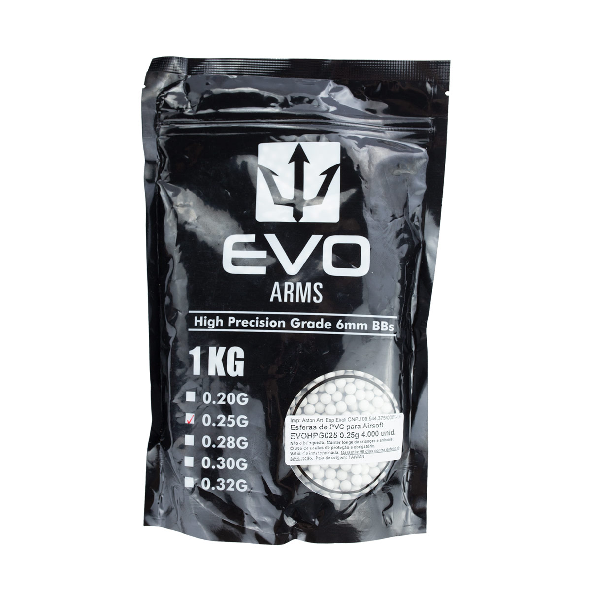 Esferas plásticas Airsoft 6mm (BBs) fabricada pela Evo Arms, na série High Precision com gramatura de 0,25g.