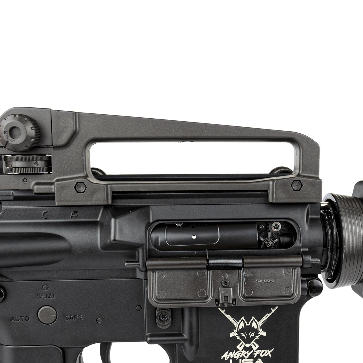 É uma AEG modelo M4, com um carry handle que facilita o transporte do equipamento.