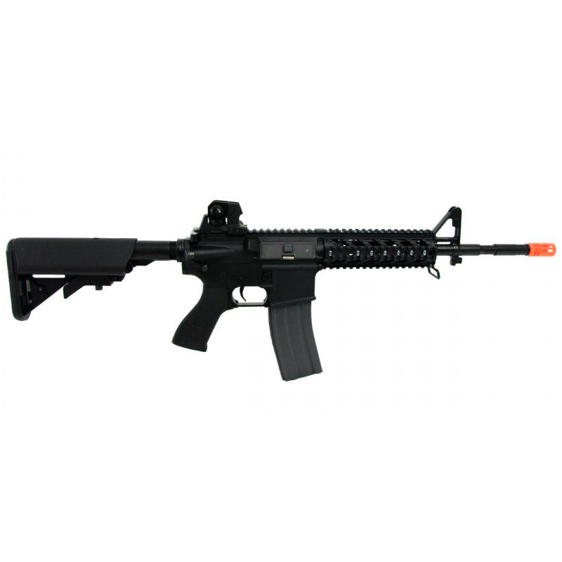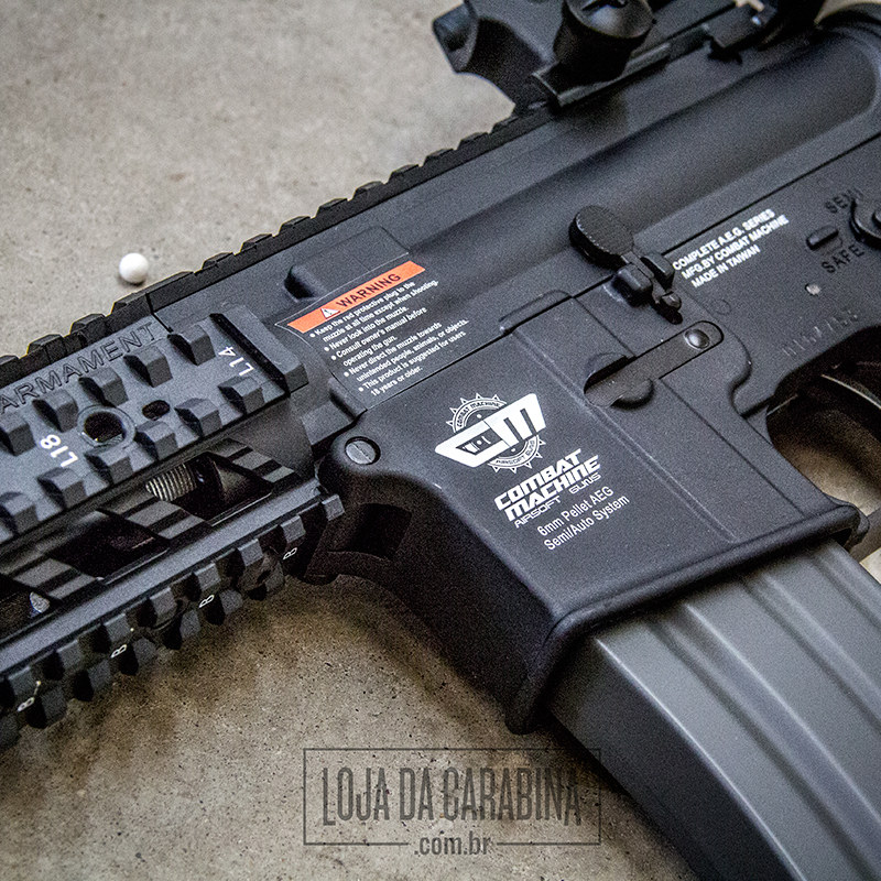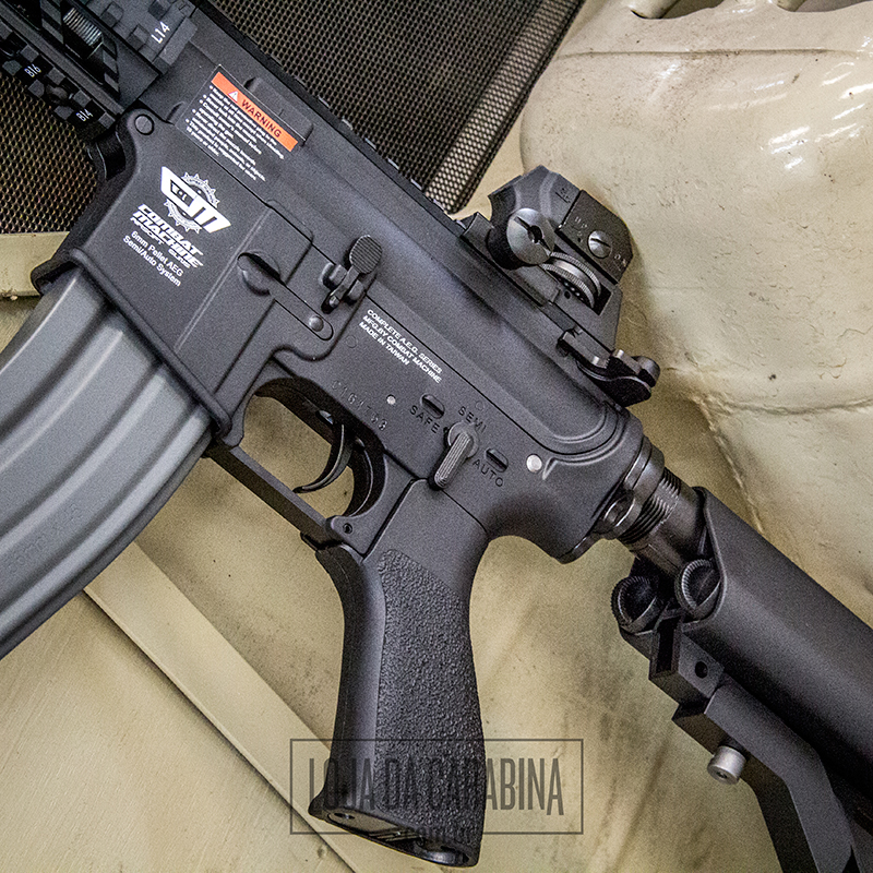Constituido em metal e polímero de alta densidade, possui trilho RIS 20mm, gear box de metal com engrenagens de aço, coronha modelo Crane ajustável em 5 posições, magazine Hi cap para 350 bbs, pontaria ajustável com massa de mira removível e zarelho para bandoleira.
