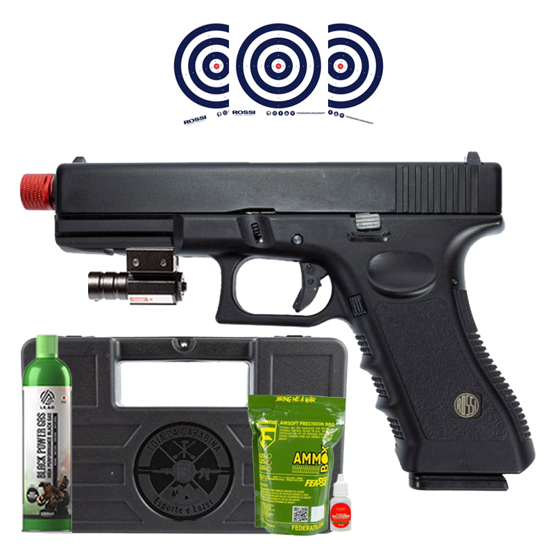 Airsoft GBB Rossi Glock V17 BlowBack 6mm + Maleta LC + Green Gas + Mira Laser + BBs + Oleo + Alvos