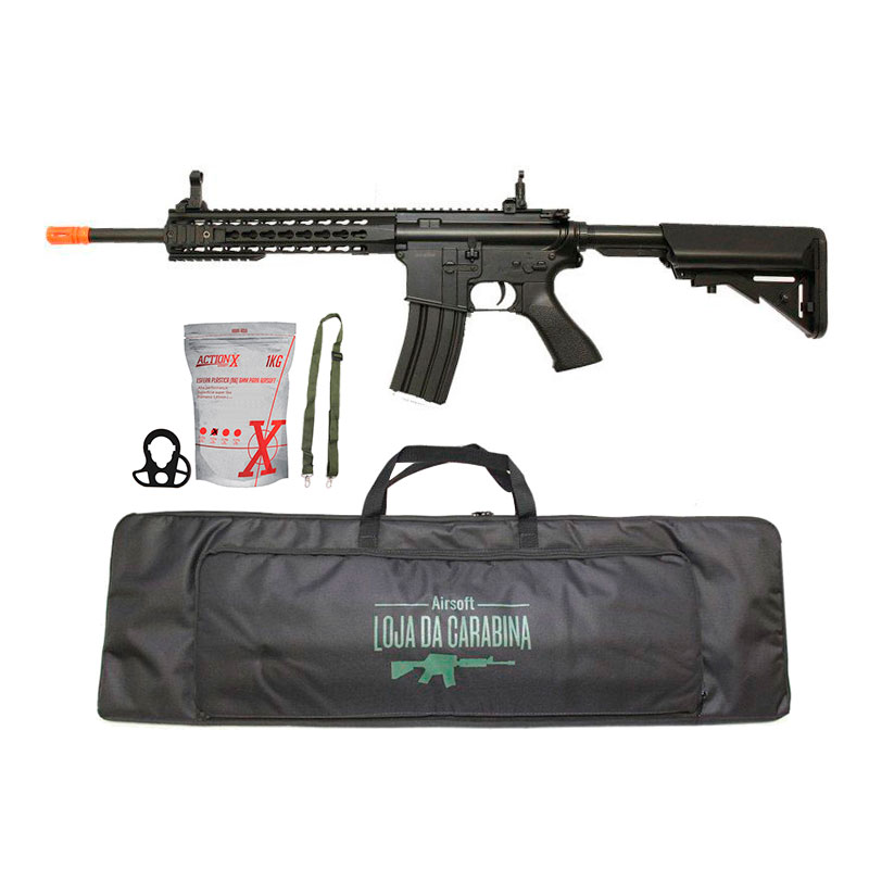 Arma de Airsoft M4A1 com corpo todo de polímero de alta qualidade, garantindo durabilidade ao rifle.