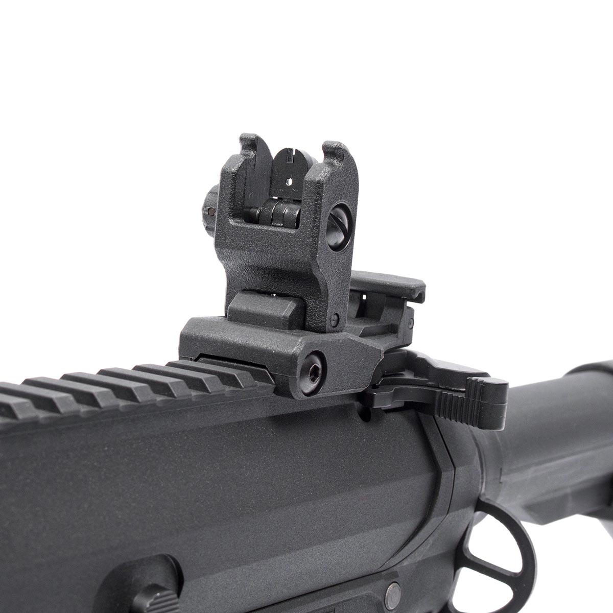 - Mira: Conjunto de alça e massa rebatíveis (Flip-up)