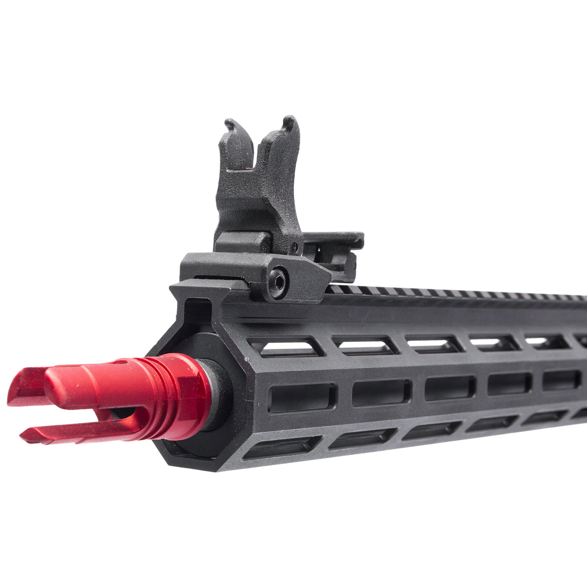 - Flash Hider: Em metal, cor vermelha, rosca 14mm esquerda (anti-horário)