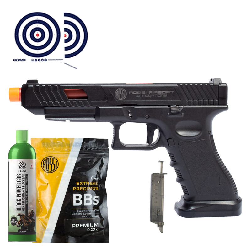 Mega KIT da G34 Combat Rossi! Conta com Green Gás para ativar o sistema de ação da GBB, BB's 0.20g para municiar seu equipamento, Speedloader para facilitar na recarga e Alvos de Treino Rossi.