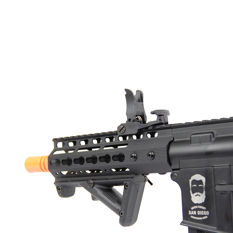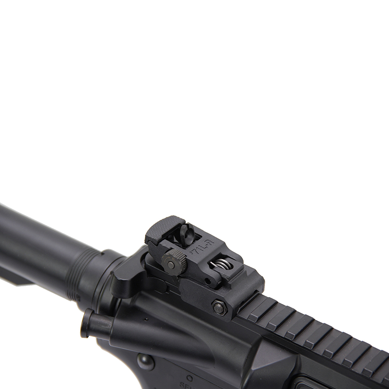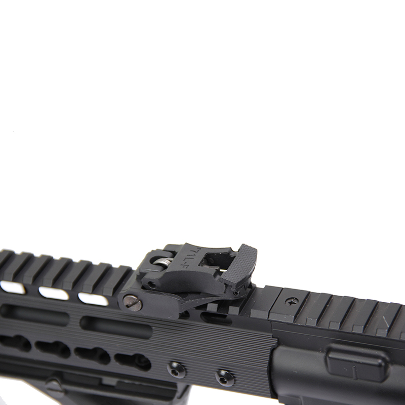 Além disso conta com um front grip angular em polímero já instalado, auxiliando na pegada dessa AEG, aumentando o seu desempenho nos jogos.