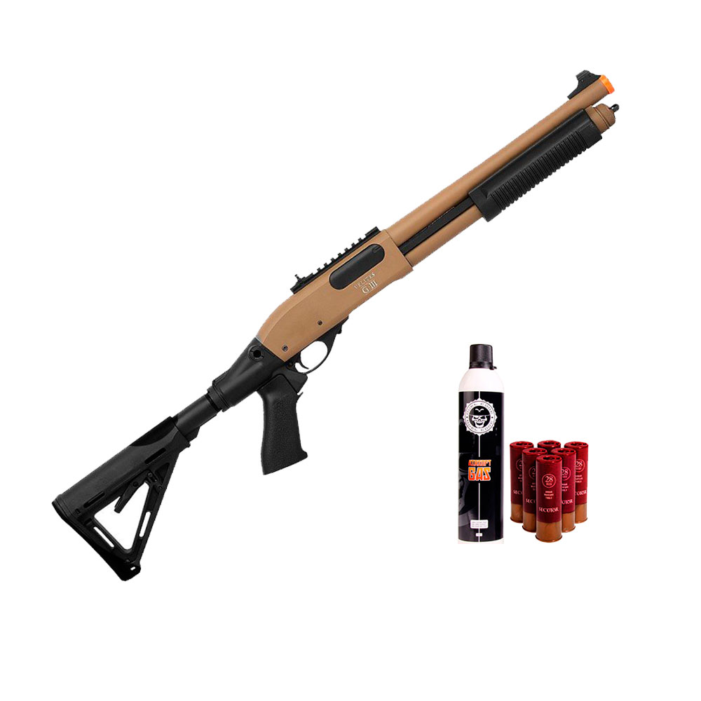 Shotgun Airsoft Secutor Arms Velites G-III, contruída em metal com ação por green gás ou gás propano, trata-se de uma linha premium para os jogadores que estão a procura de potência, precisão e qualidade de acabamento.