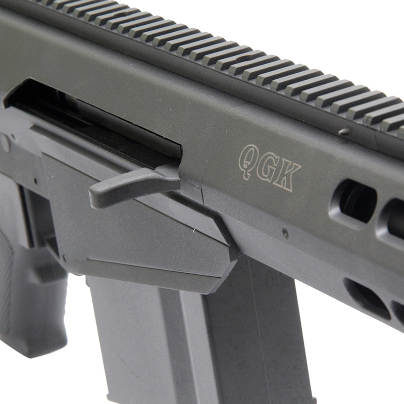 Magazine tem capacidade de 50 rounds e possui um reservatório em sua lateral.