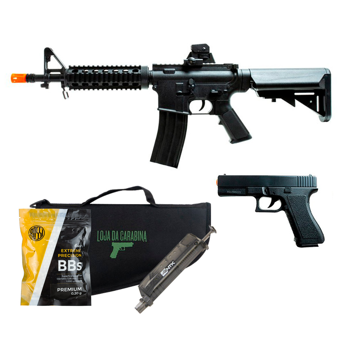Combo Vigor, Rifle Airsoft M4A1 e Pistola GK-V307, Possuem sistema de engatilhamento de ação por mola.