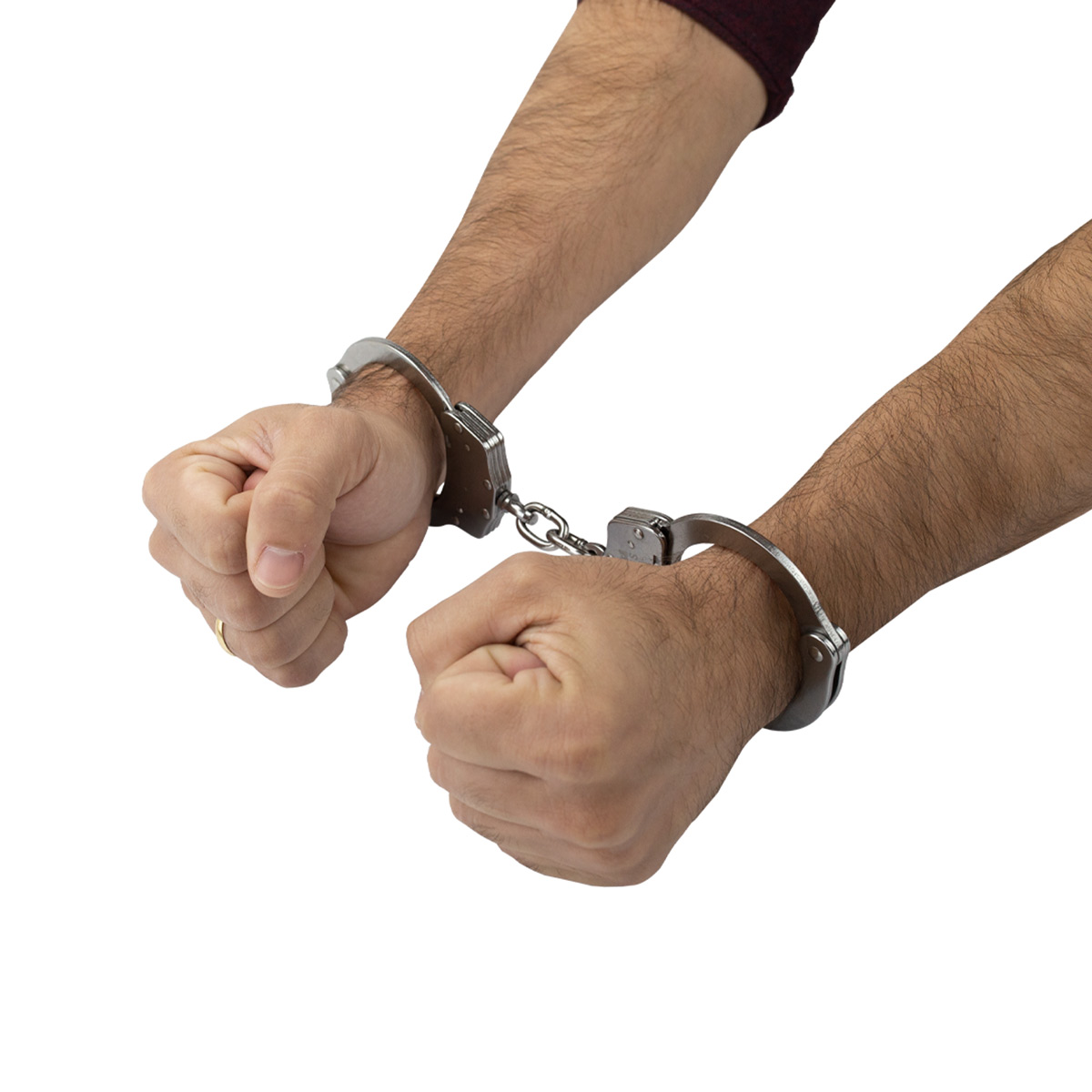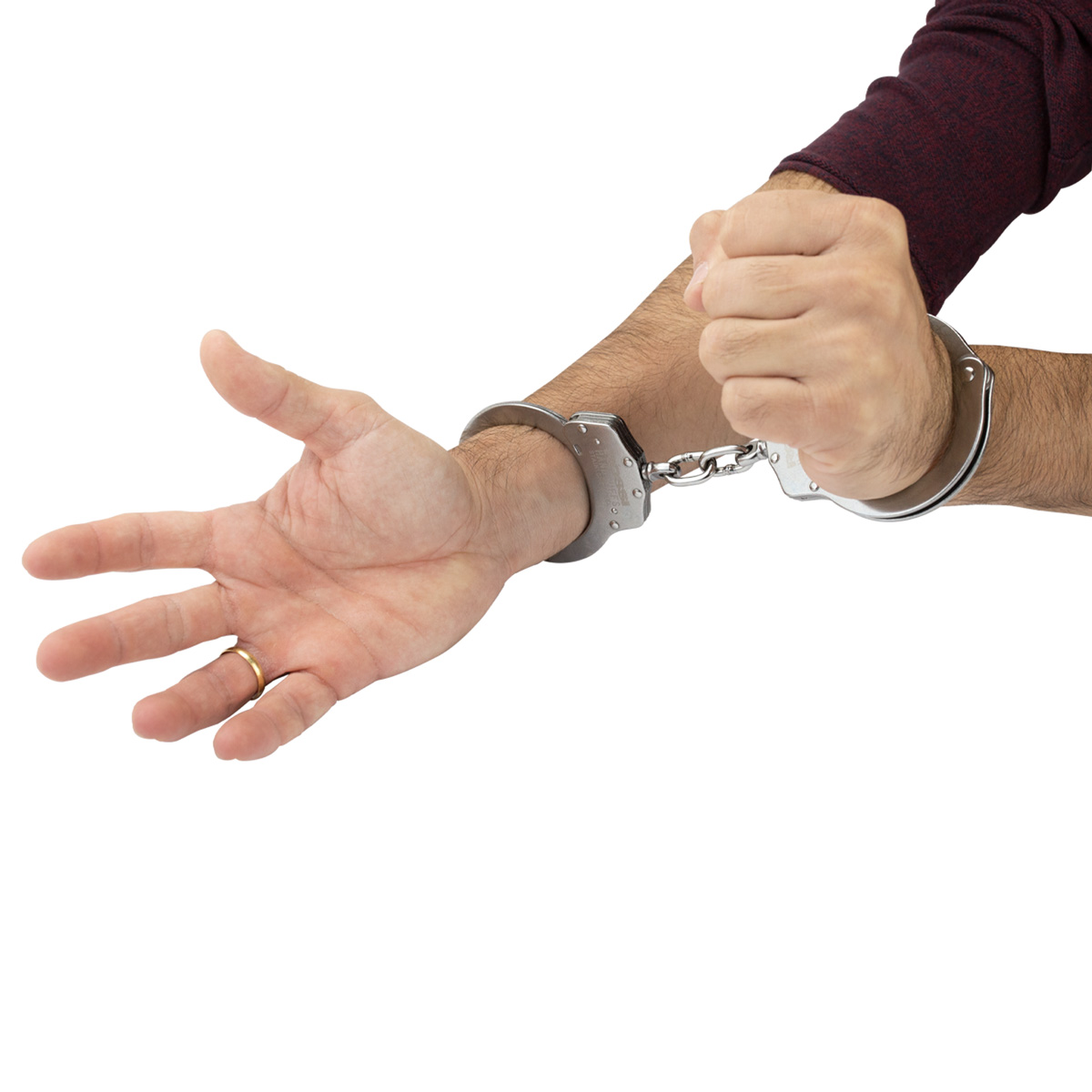Com a algema travada no pulso, use a ponta na chave para empurrar o pino na borda da algema. Agora o maxilar está travado contra movimentos em qualquer direção.