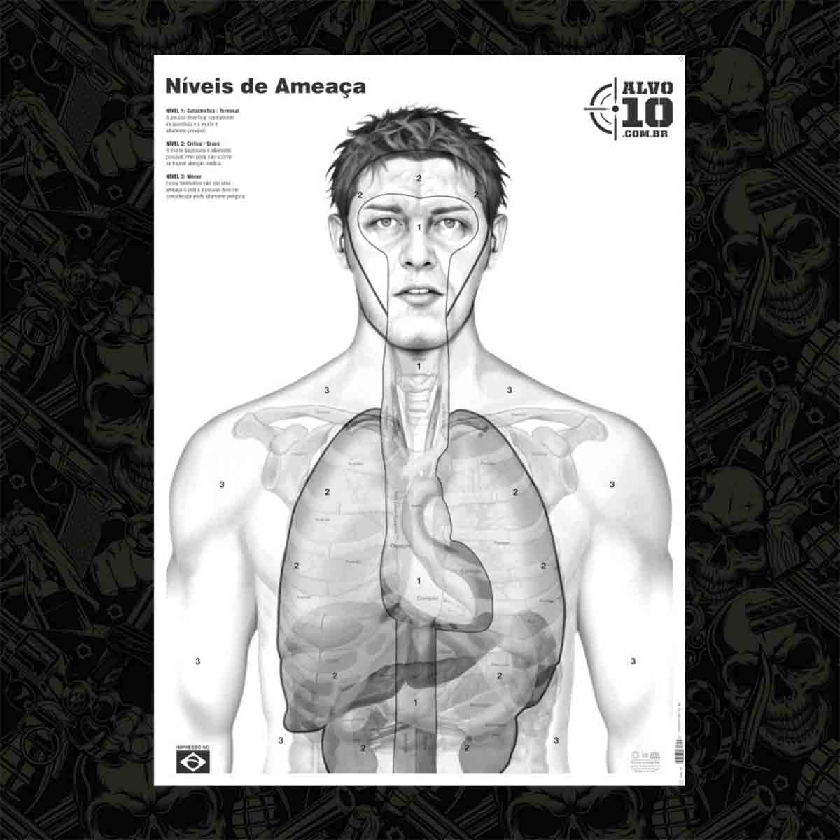 O Alvo Níveis de Ameaça foi desenvolvido para atender treinamentos operacionais de alto nível, especialmente voltados a forças de segurança, segurança privada e usuários que buscam maior realismo e consciência técnica durante os exercícios. Sua ilustração apresenta proporções corporais realistas, com zonas anatômicas bem definidas, facilitando a identificação de áreas vitais e não vitais.