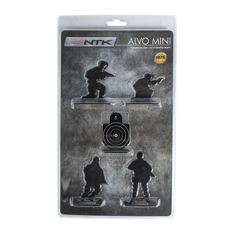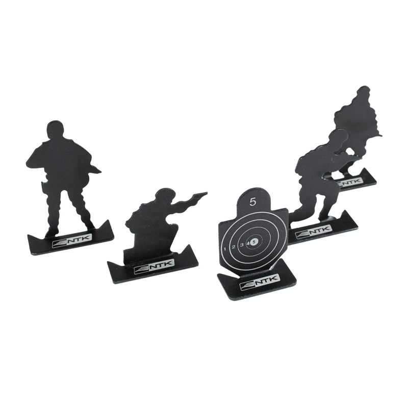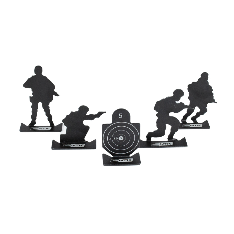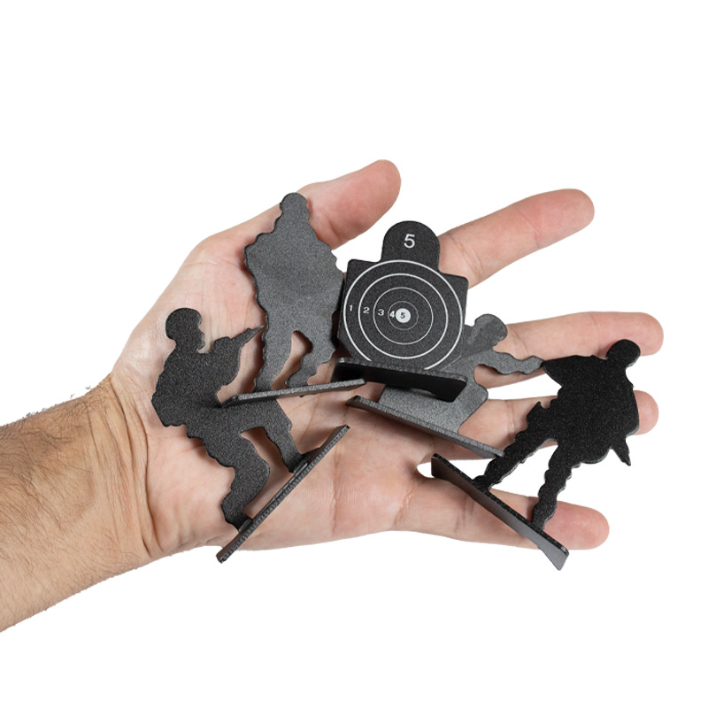 Pequenos Alvos para Airsoft em alumínio, contém 5 alvos silhueta com marcações do A ao D para prática de tiro.