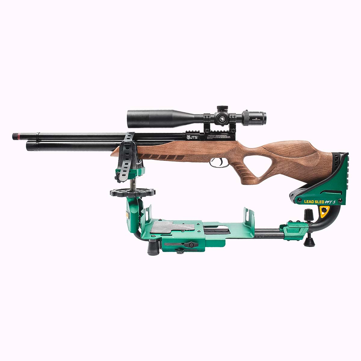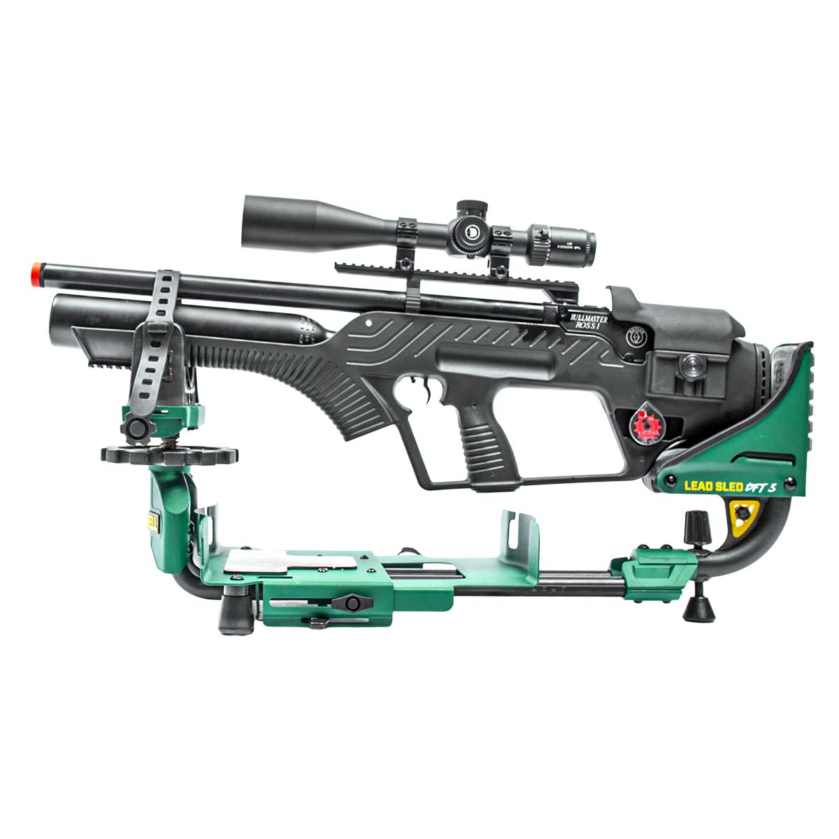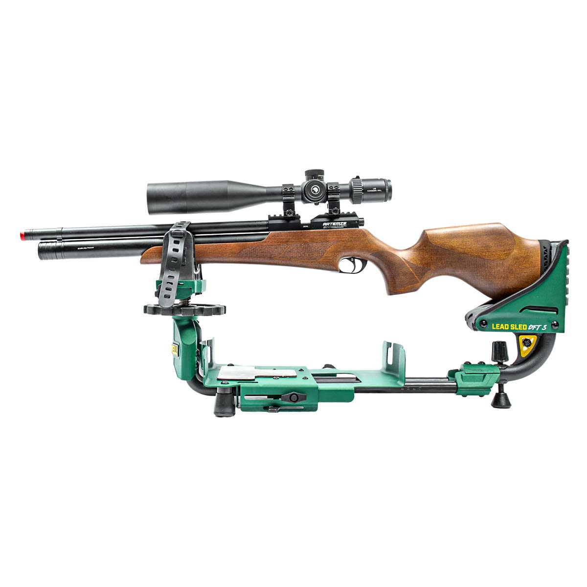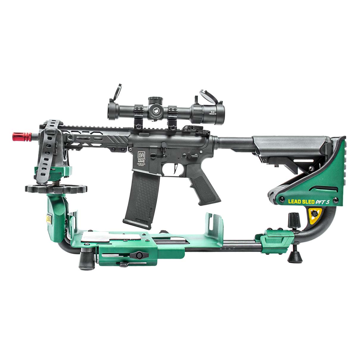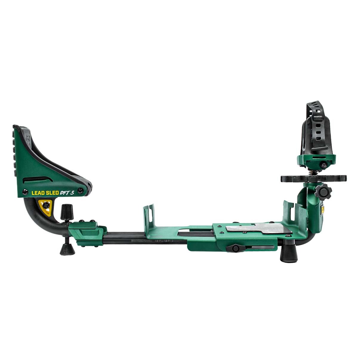 Para facilitar o posicionamento preciso da arma, o Lead Sled DFT 3 possui ajustes de elevação frontal e traseira acionados com a ponta dos dedos, permitindo micro ajustes rápidos e precisos no alinhamento com o alvo.
