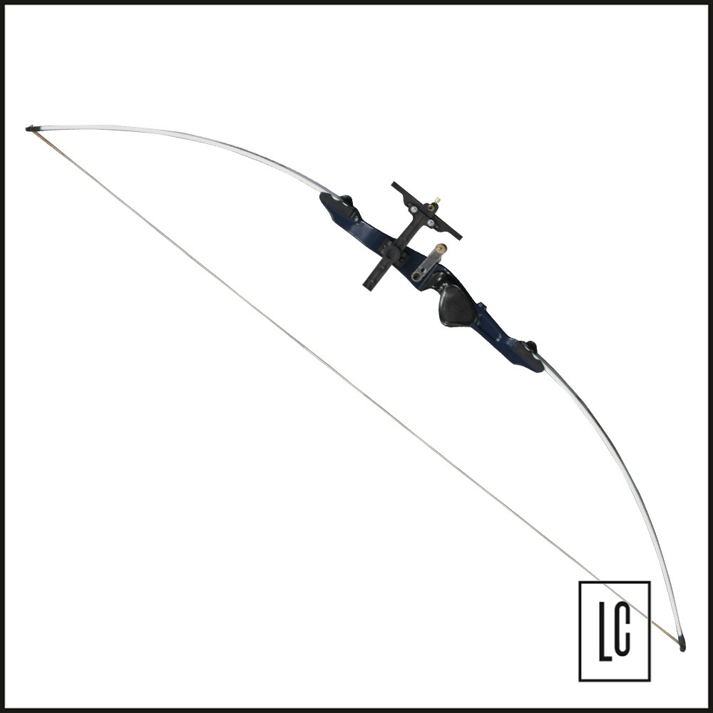 O arco é do tipo balanceado de 48 libras, de fibra de vidro, com corda multifilamento de poliamida e empunhadura de alumínio.