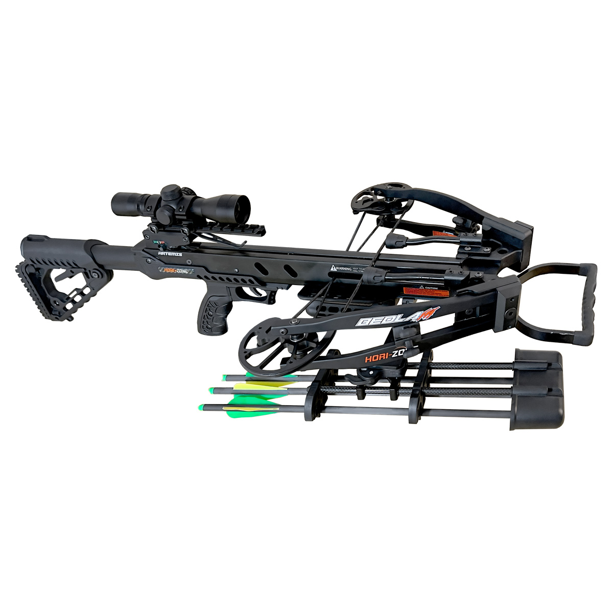 Acompanha aljava com hastes em carbono e 03 setas 20” de fibra de carbono. Também acompanha cera lubrificante, corda auxiliar e bandoleira para facilitar o uso da balestra composta Hori-Zone.