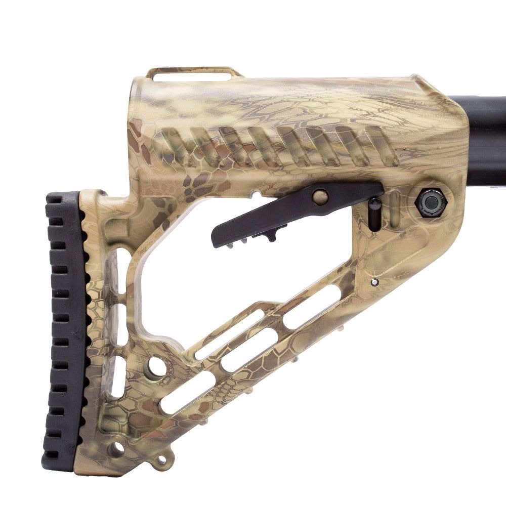 Possui coronha tática ajustável Back-End do tipo AR 15, com 05 níveis de ajuste de posição, entregando maior praticidade e conforto para o atirador. A coronha é fabricada em polímero de alta densidade na cor preta.
