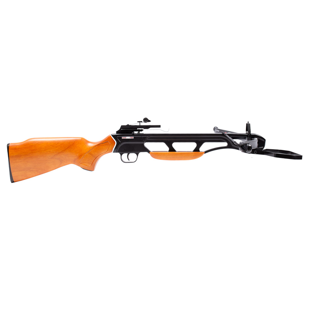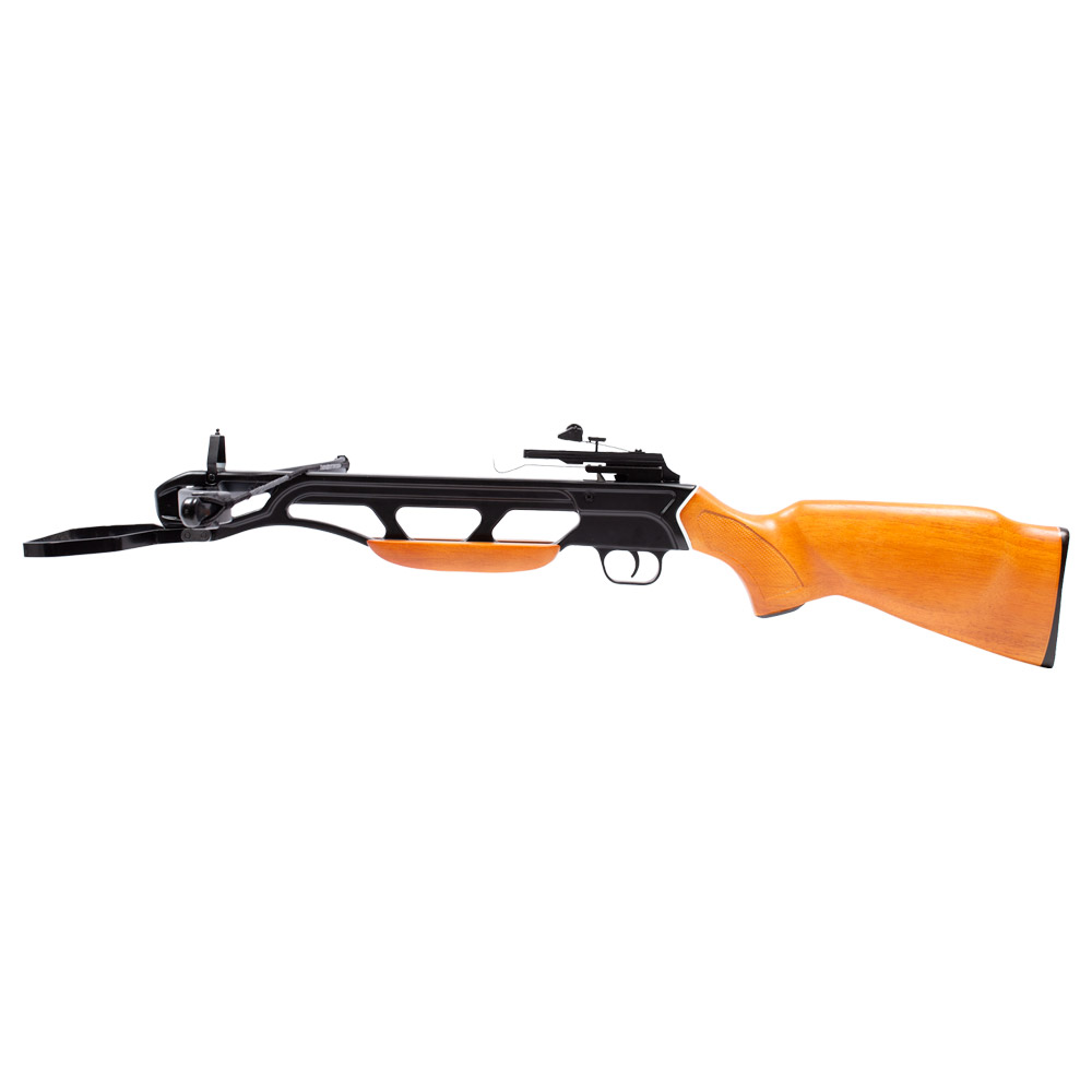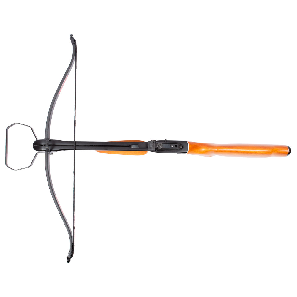 Possui arco de fibra de vidro, cano em alumínio, coronha do tipo Monte Carlo ambidestra.