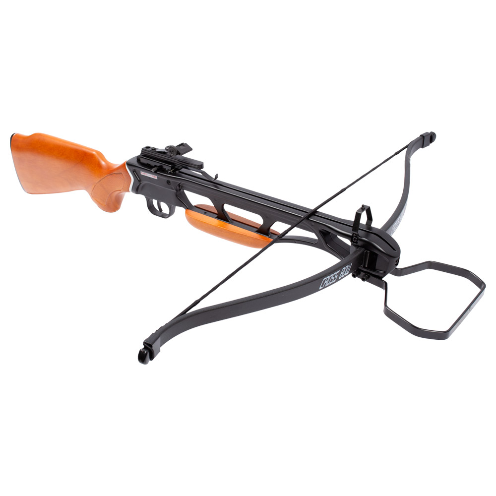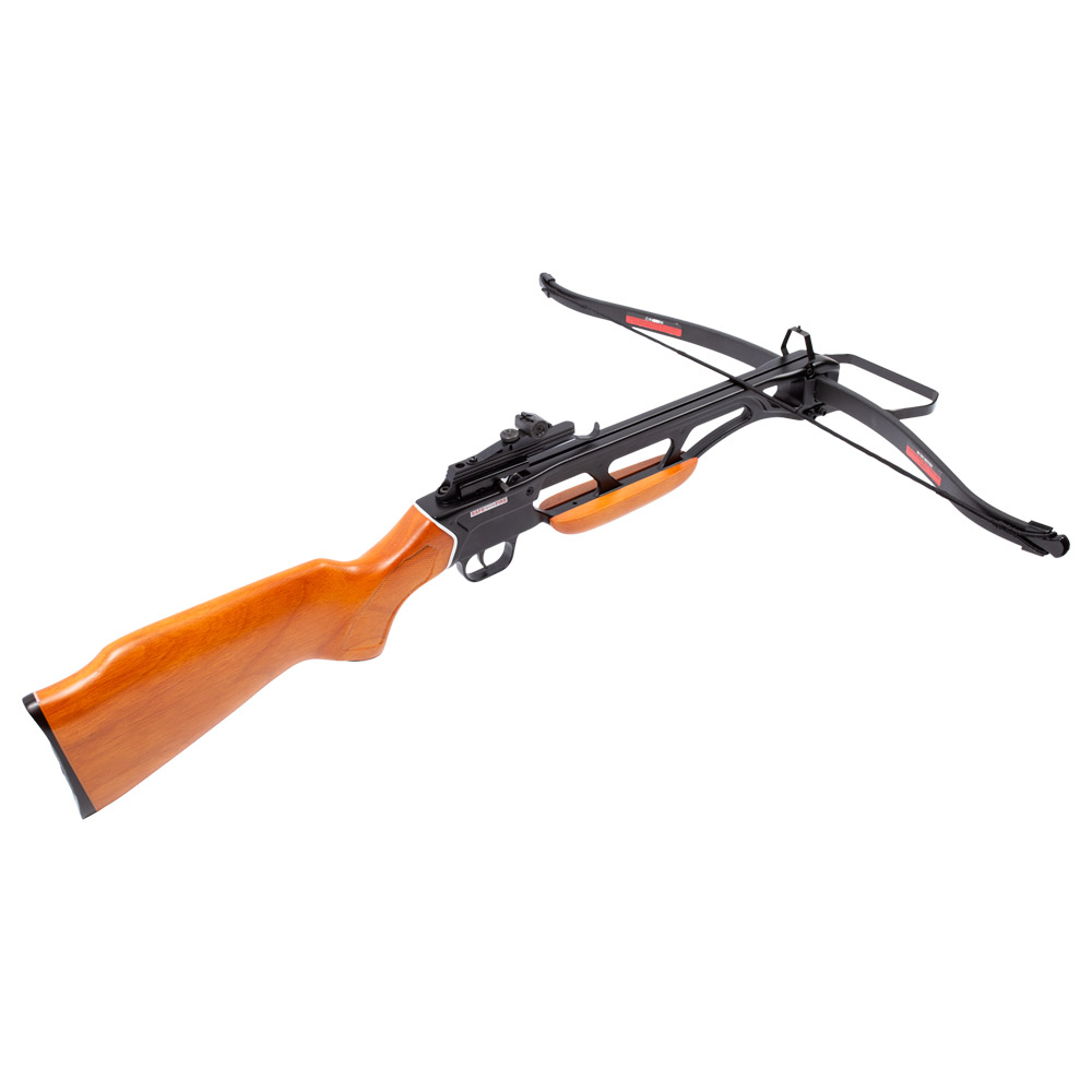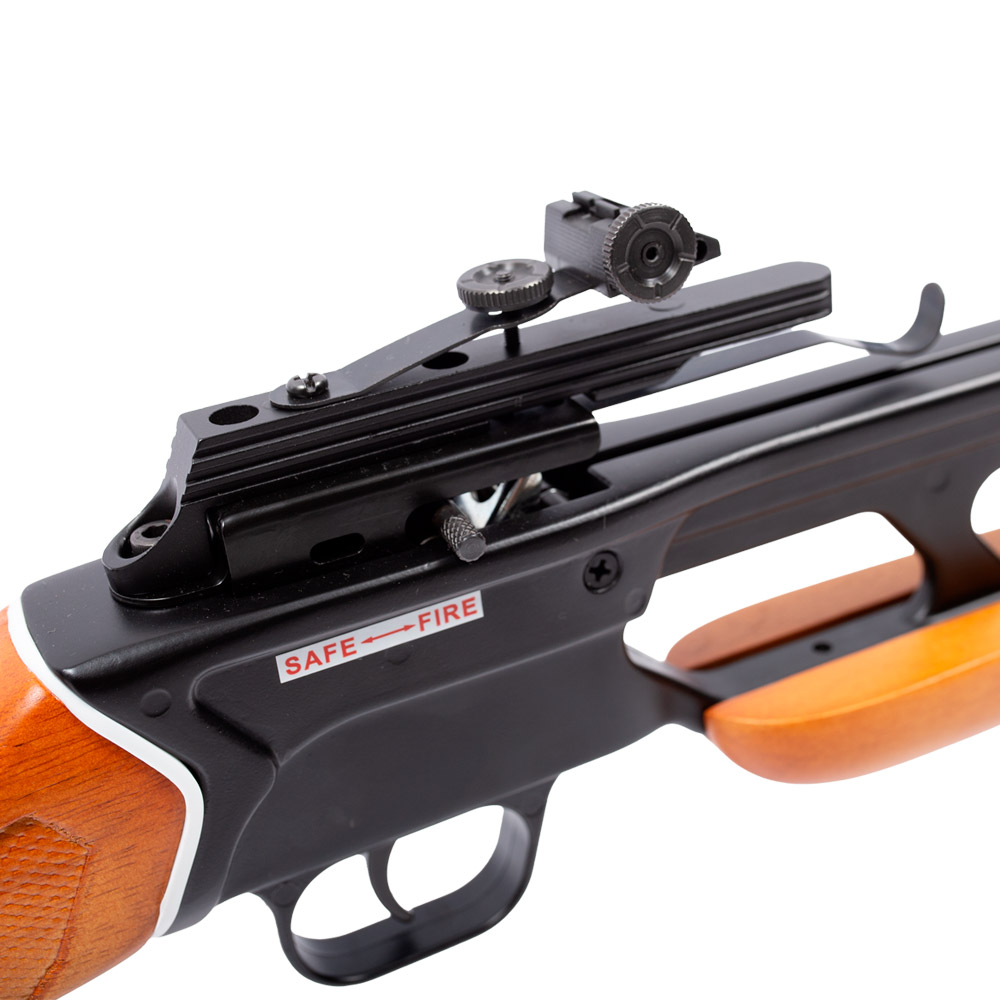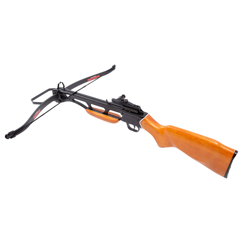 Possui arco de fibra de vidro, cano em alumínio, coronha do tipo Monte Carlo ambidestra.
