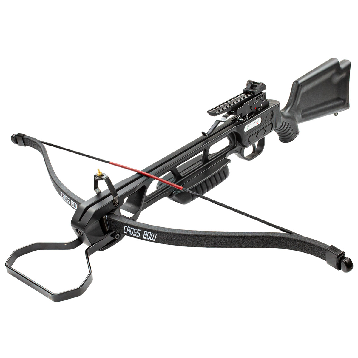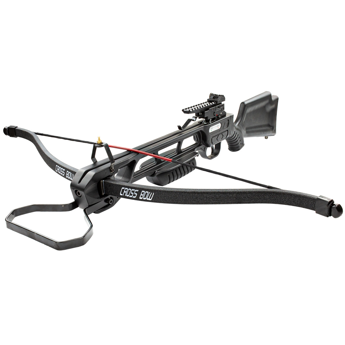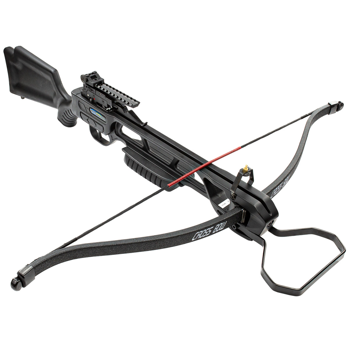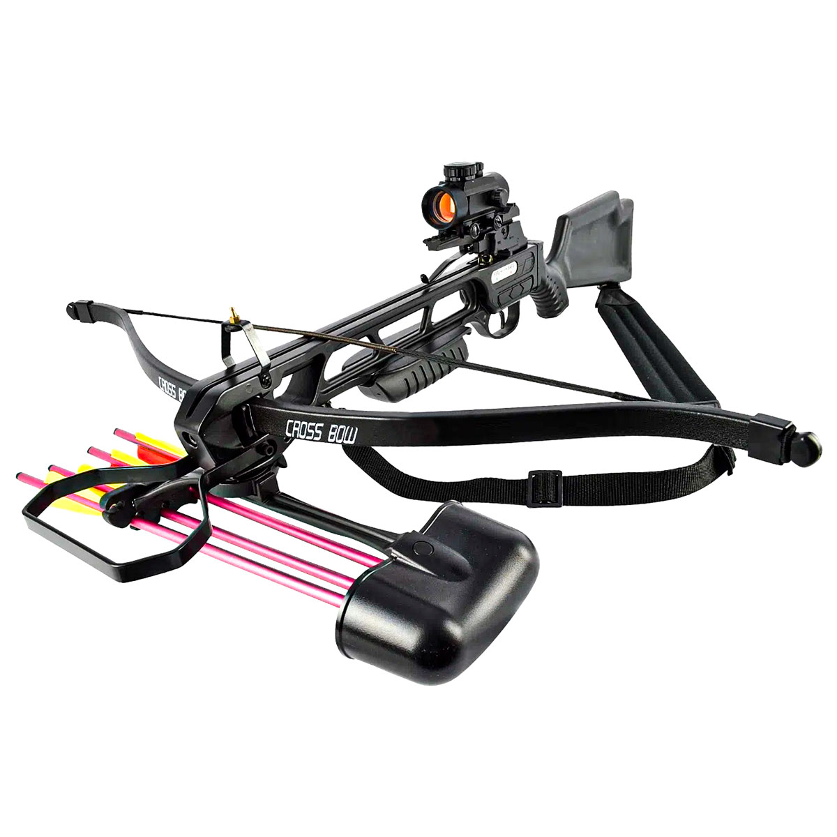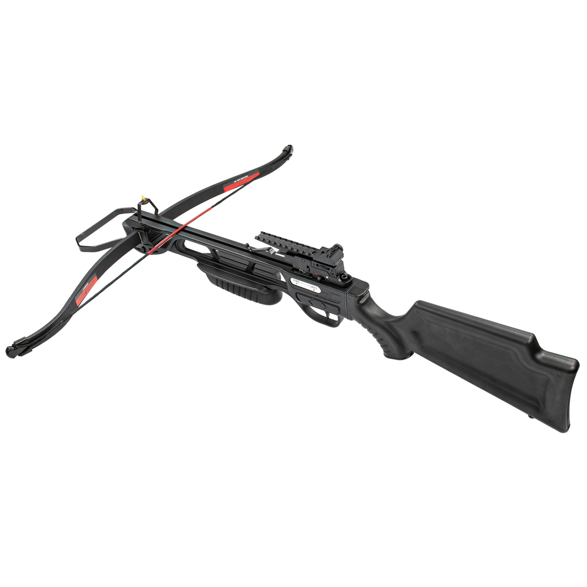 Conta com aljava com capacidade para 4 setas que acompanham essa Balestra Man Kung. As setas são em alumínio e tem comprimento de 16 polegadas.