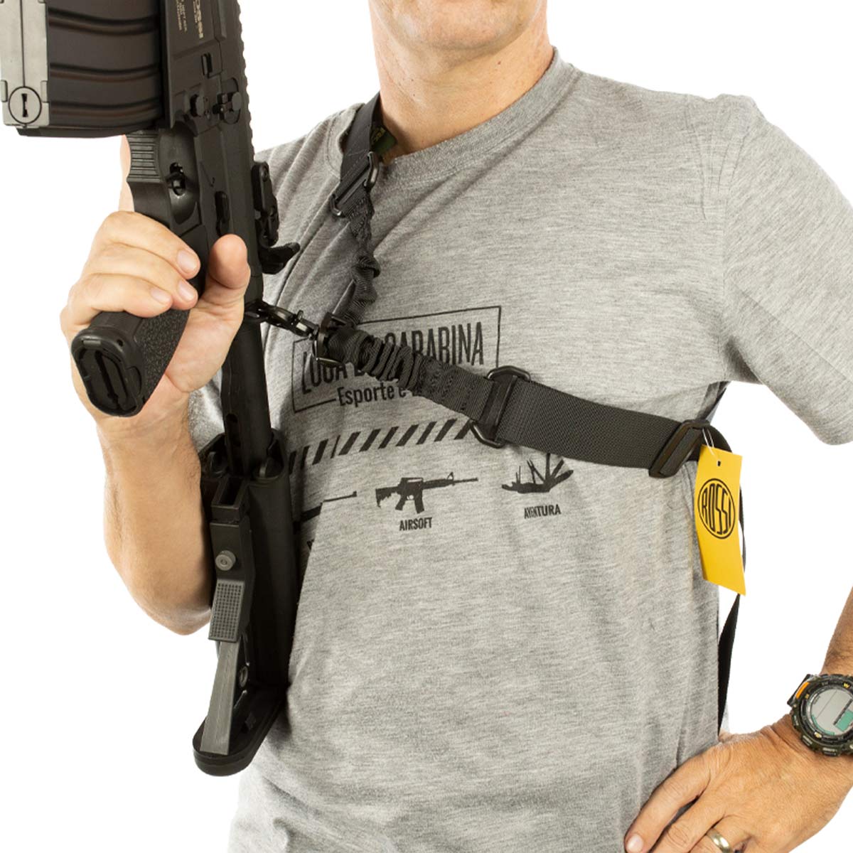 Bandoleira com engate rapido, possui sistema de elástico.