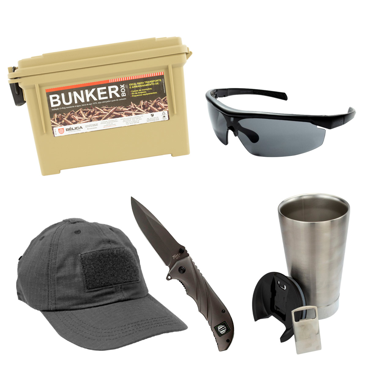 BUNKER BOX BÉLICA COYOTE + CANIVETE + BONÉ + COPO TÉRMICO + ÓCULOS