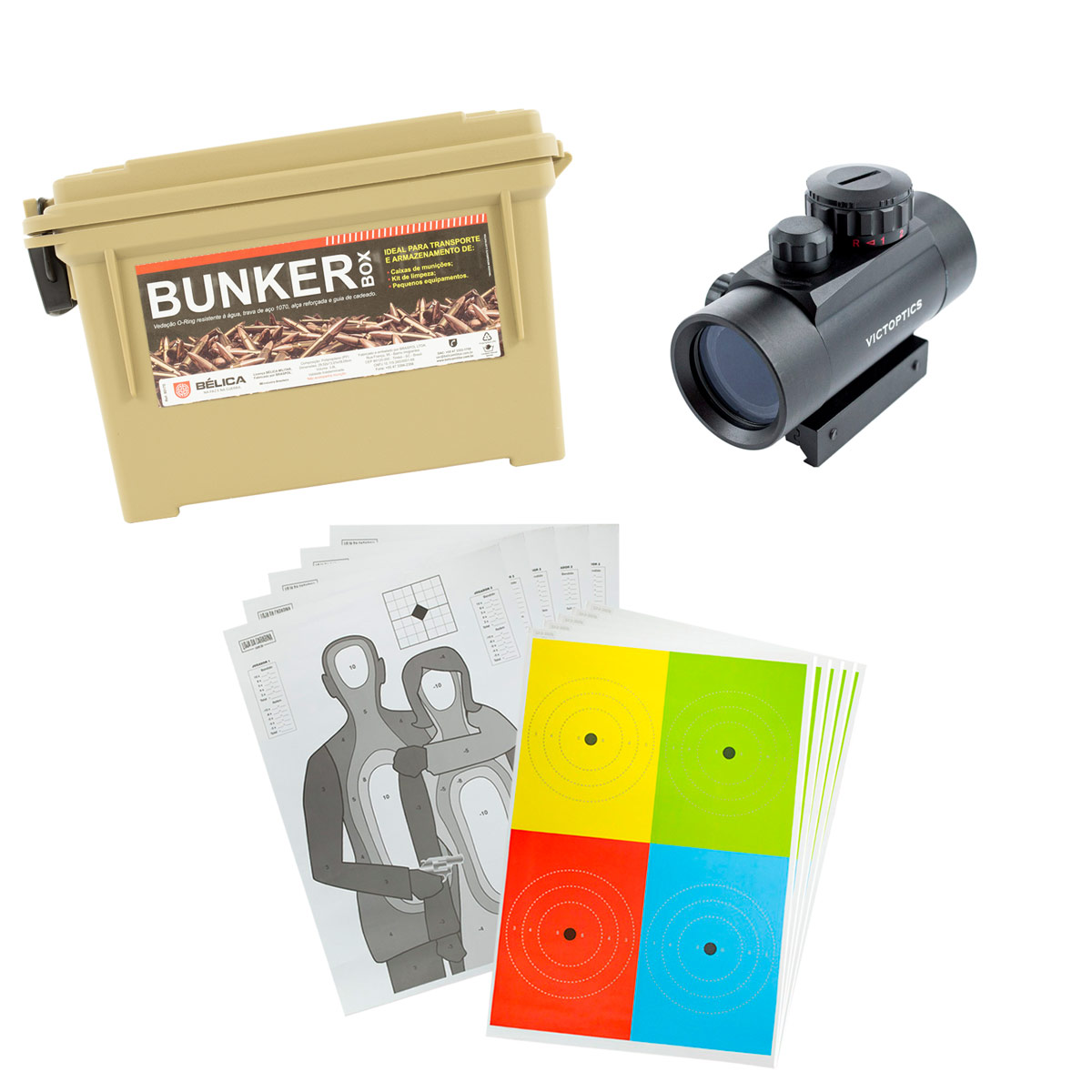 BUNKER BOX BÉLICA COYOTE + RED DOT + ALVOS