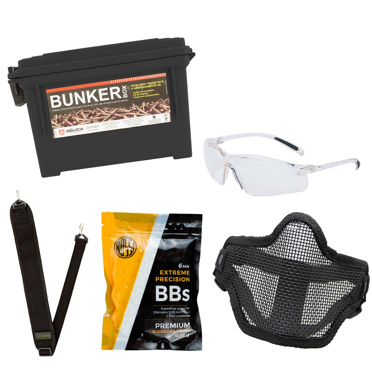 BUNKER BOX BÉLICA PRETA + BANDOLEIRA + ÓCULOS + MÁSCARA + BB'S