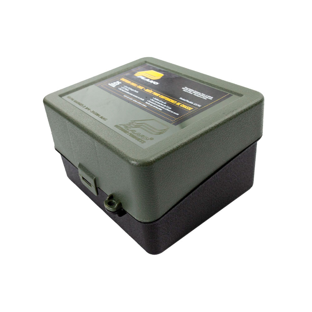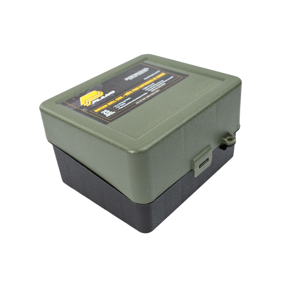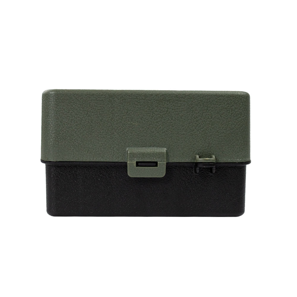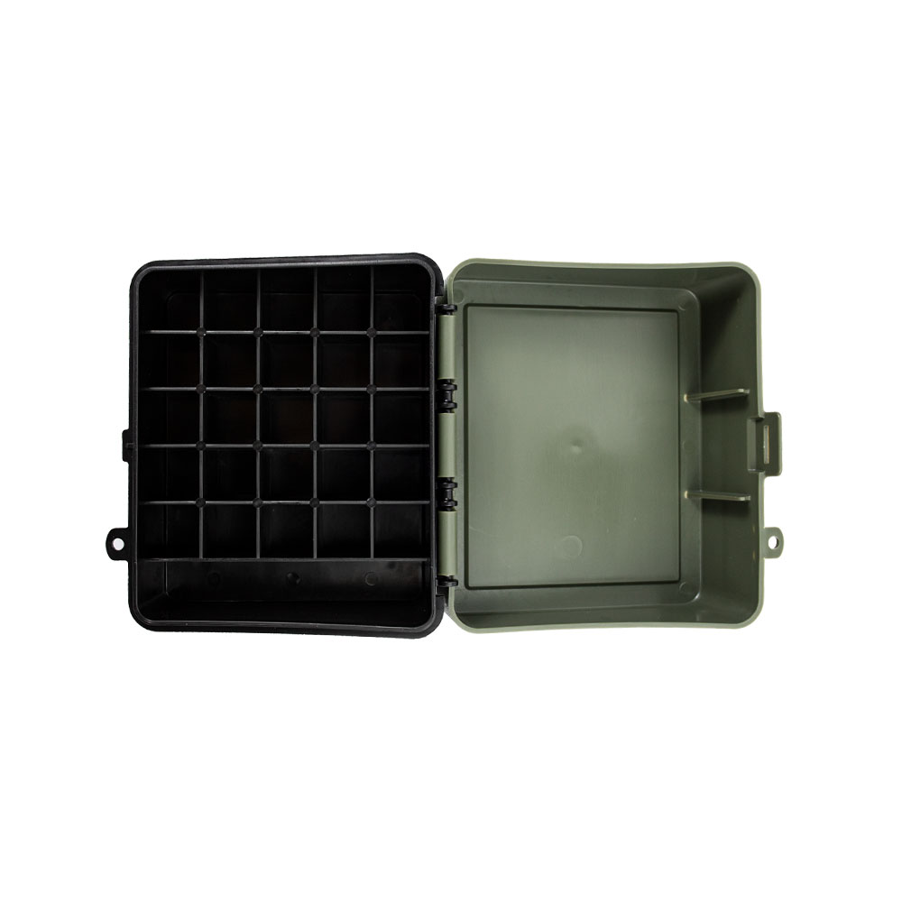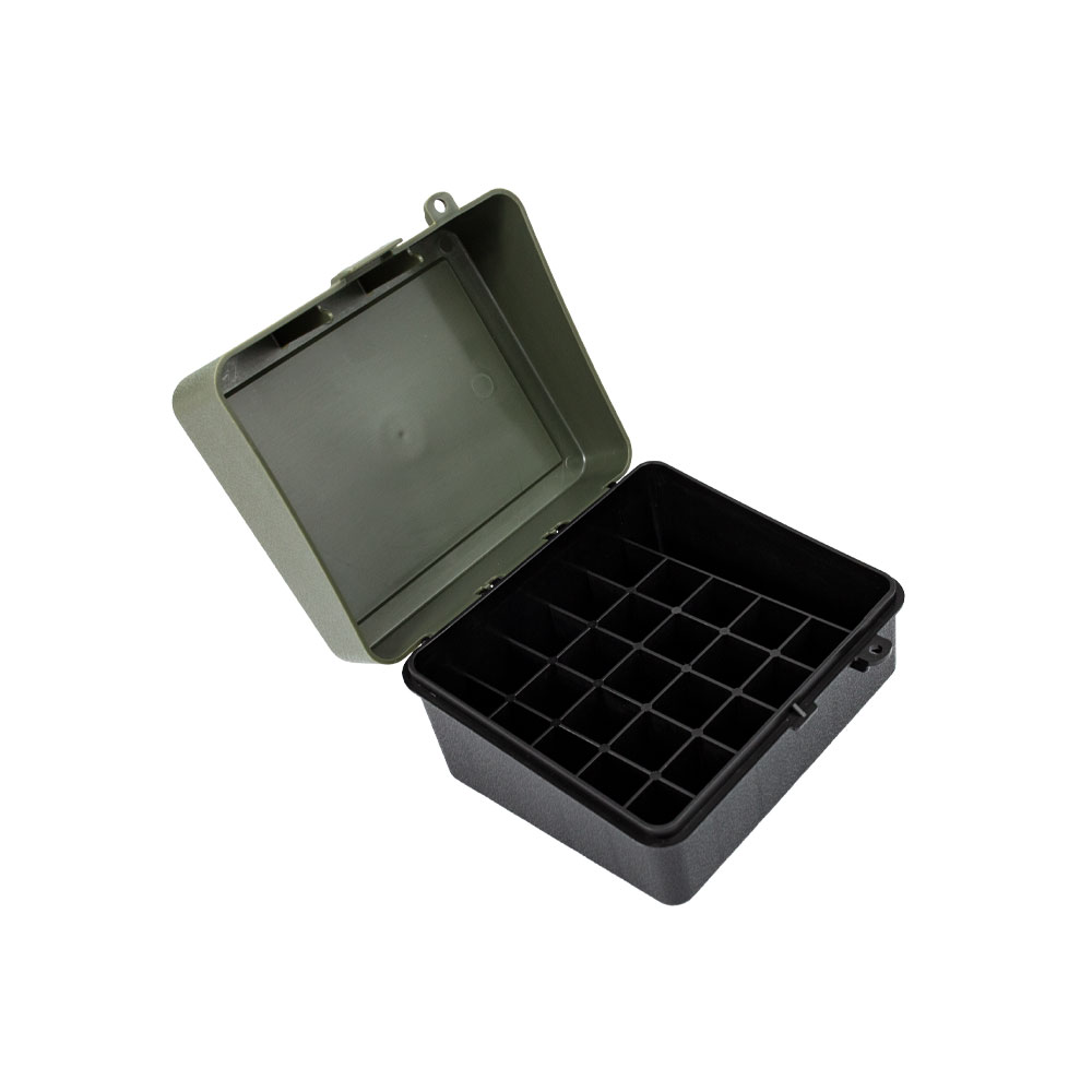 Caixa plano em polímero para até 25 cartuchos de calibre 12 na cor preta com tampa verde. Alta resistência, oferece grande praticidade para guardar os seus cartuchos.