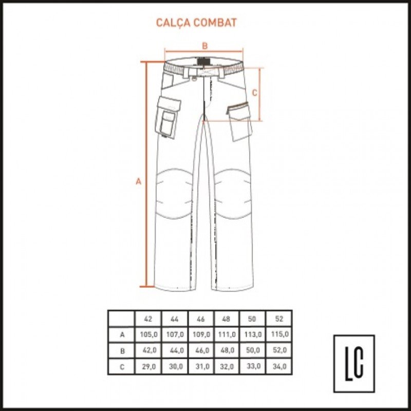 A Calça Combat foi desenvolvida para uso tático e militar. Sua robustez e qualidade garantem a resistência necessária para sua utilização em operações especiais e em combate. Com o design mais agressivo, diferencia-se dos demais modelos principalmente pelos reforços de tecido nas entrepernas e nas costuras. Utiliza tecido rip-stop INVITEX®, composto 100% por fios ring-spun de alta torção. Em função da alta densidade de fios, o tecido é muito resistente a rasgos e trações. Além disso, é confortável e possui acabamento soft-finishing, que proporciona o toque suave do produto. As cores têm maior durabilidade, garantidas pelo processo de tingimento reativo (VAT) direto nas fibras dos fios.