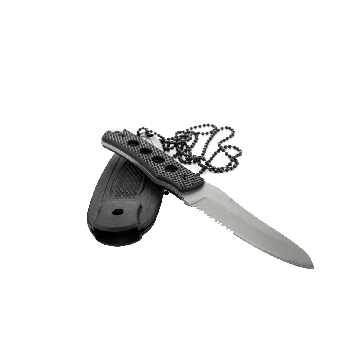 Mini faca de pescoço com lâmina em aço inox cinza com cabo resinado na cor preta com estrutura full tang.