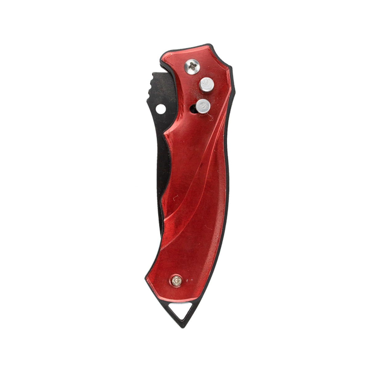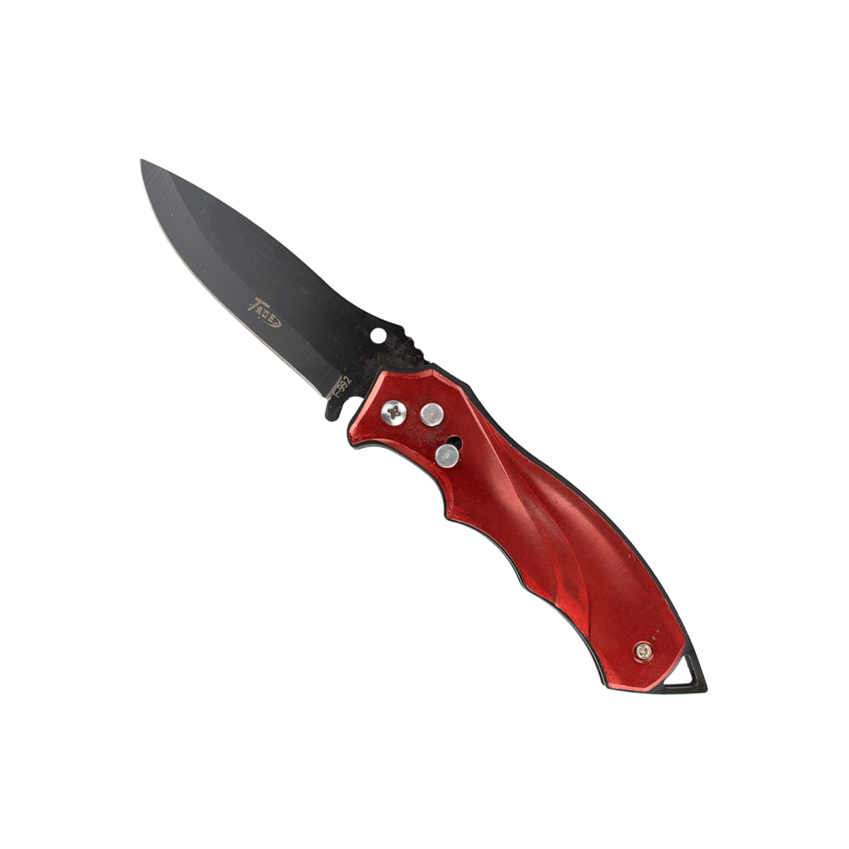 Cabo metálico na cor vermelha e Lâmina do tipo padrão na cor preta.
