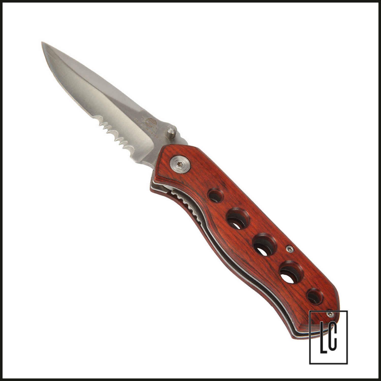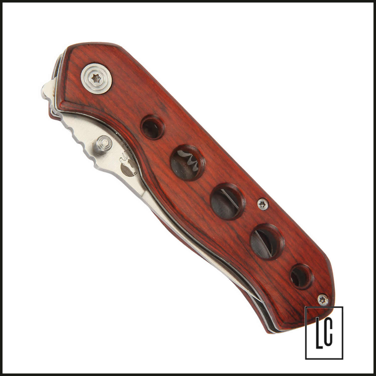 Cutelaria em aço inox polido, com detalhes em madeira de lei.