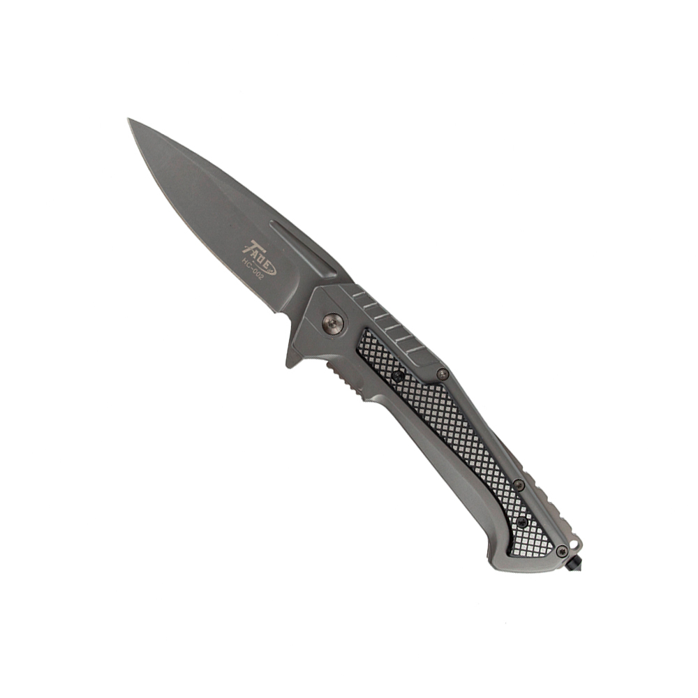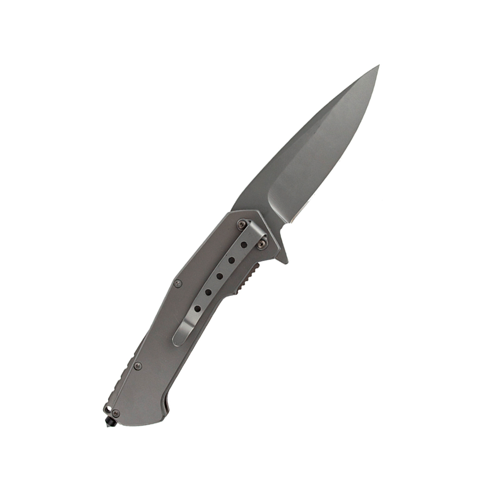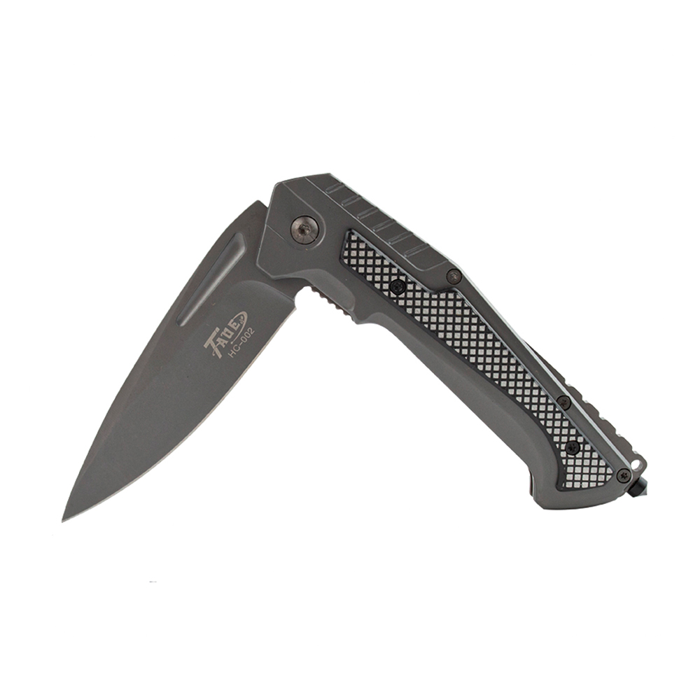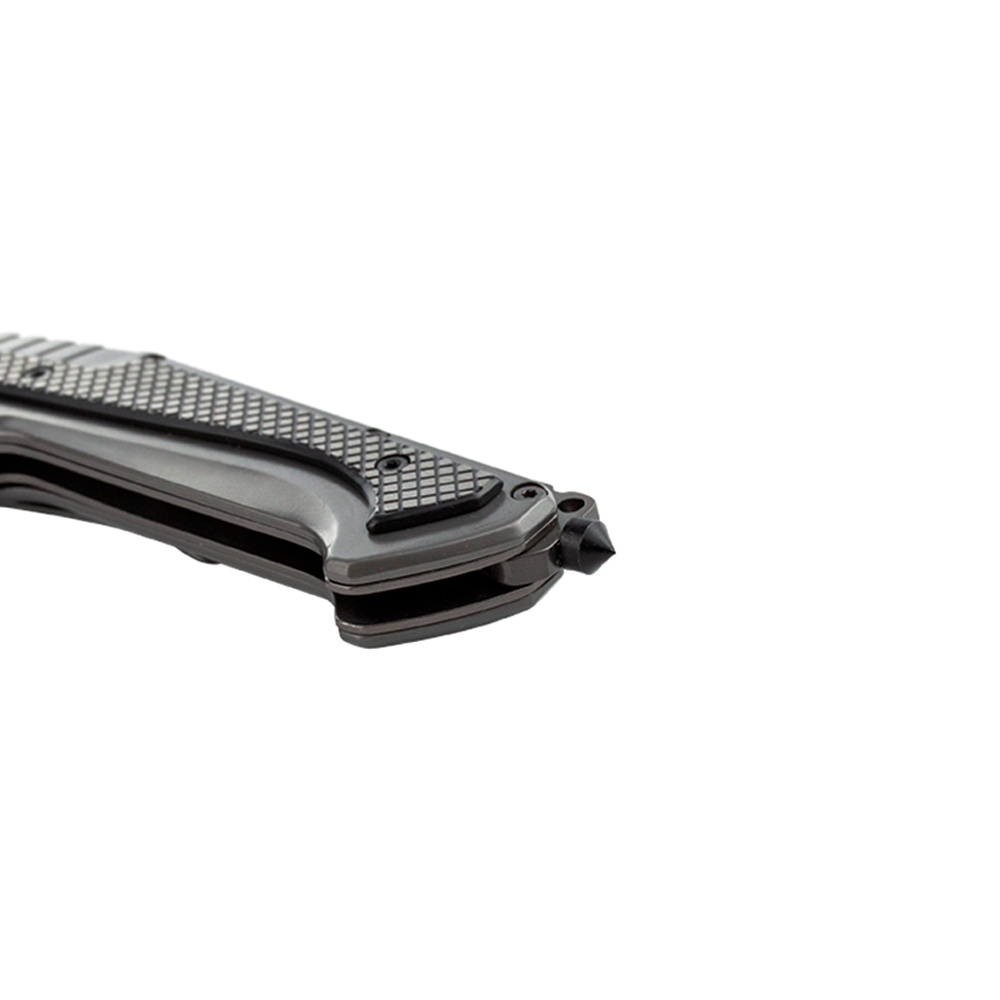 Canivete tático na cor chumbo com quebra vidro e clip de bolso.