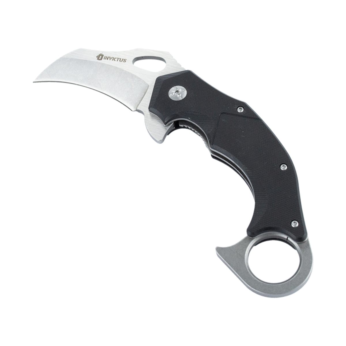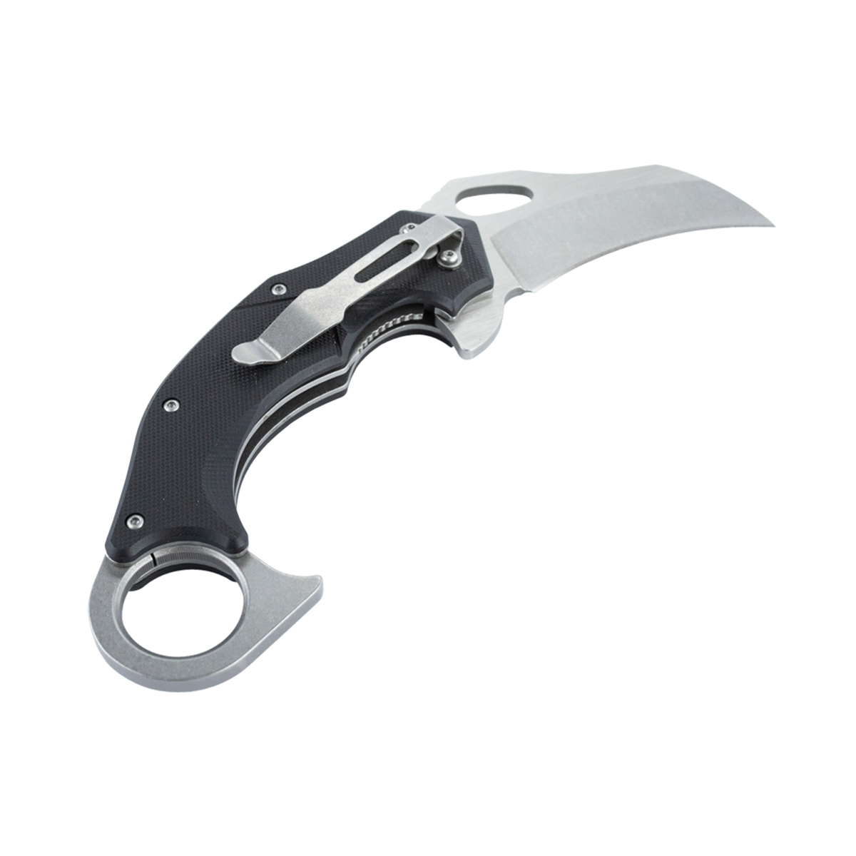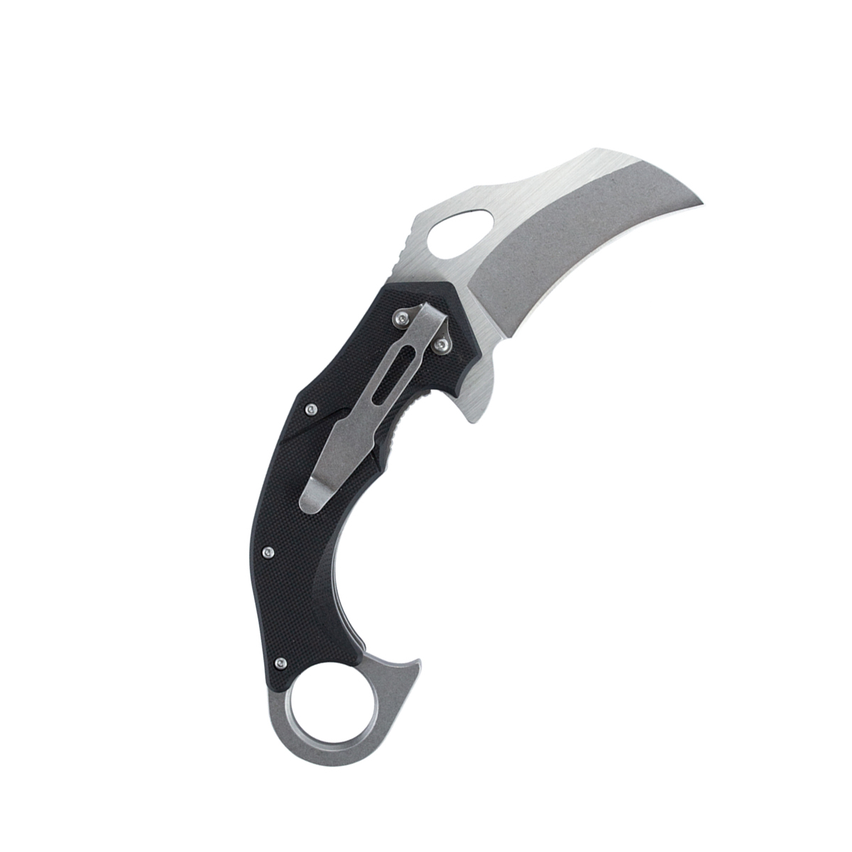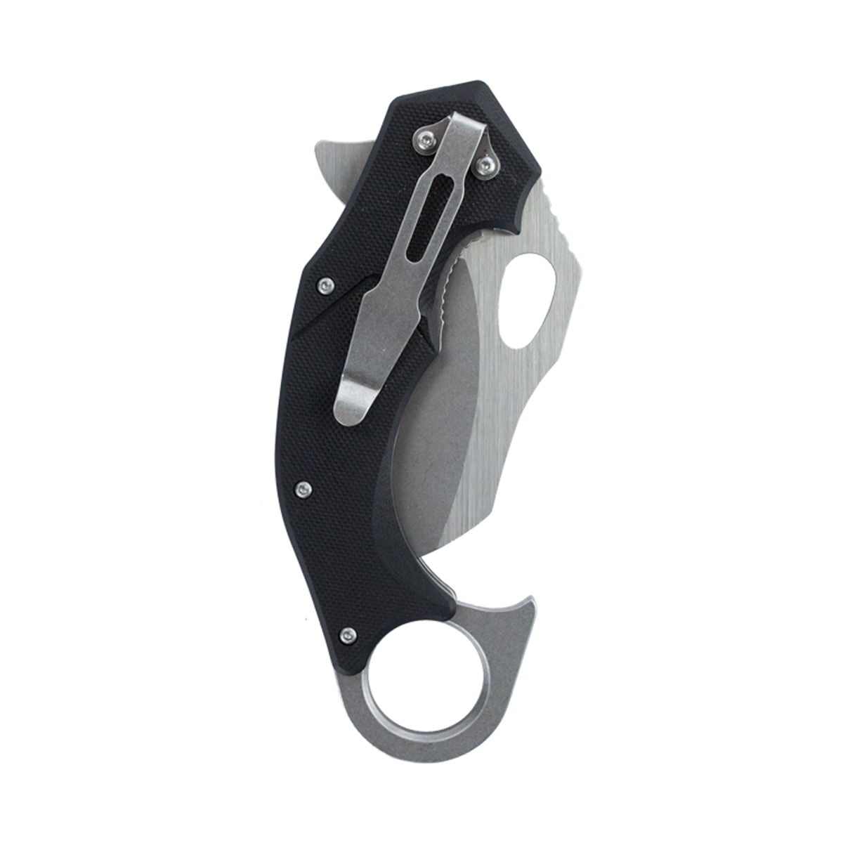 Sua lâmina é em aço inoxidável 3Cr, com acabamento escovado e empunhadura na cor preta.