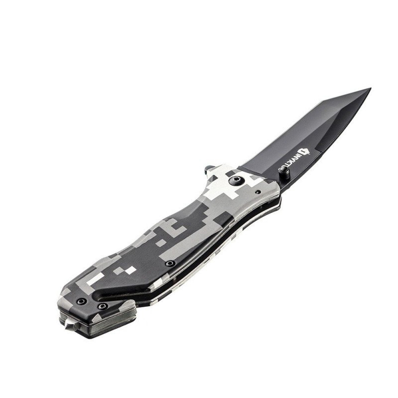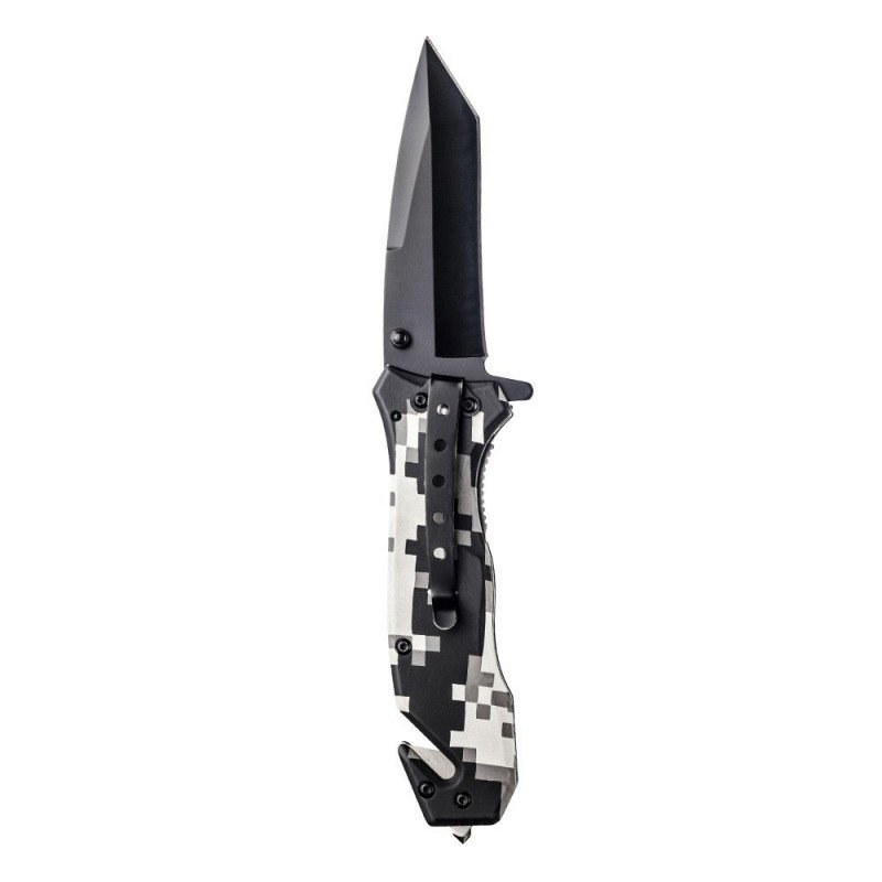 O canivete Squad possui os elementos táticos tipo corta cinto, pomo metálico (quebra vidro) e clip de fixação. Além disso, tem cabo em óxido de alumínio camuflado digital urbano.