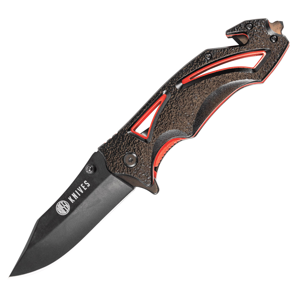 Design incrível e alta qualidade. Fabricado em aço na cor preta e com detalhes em vermelho. É um canivete muito bonito e altamente resistente e durável.