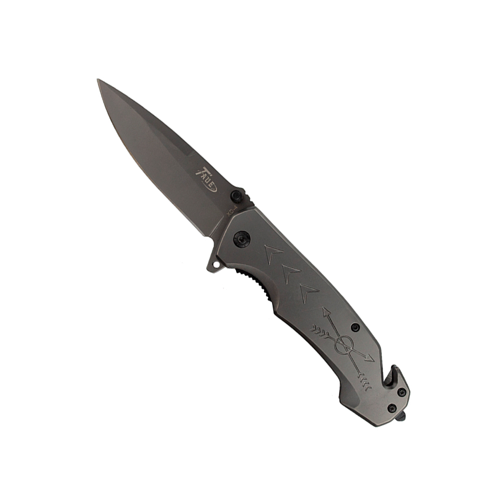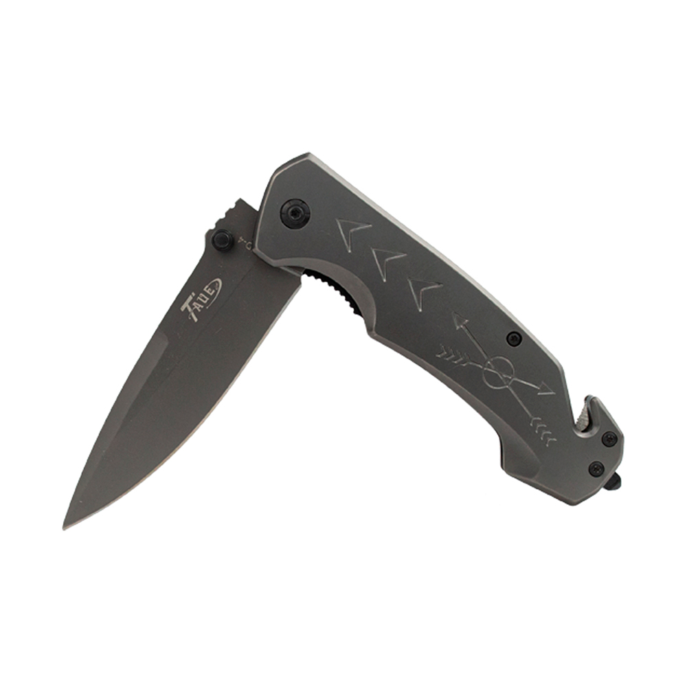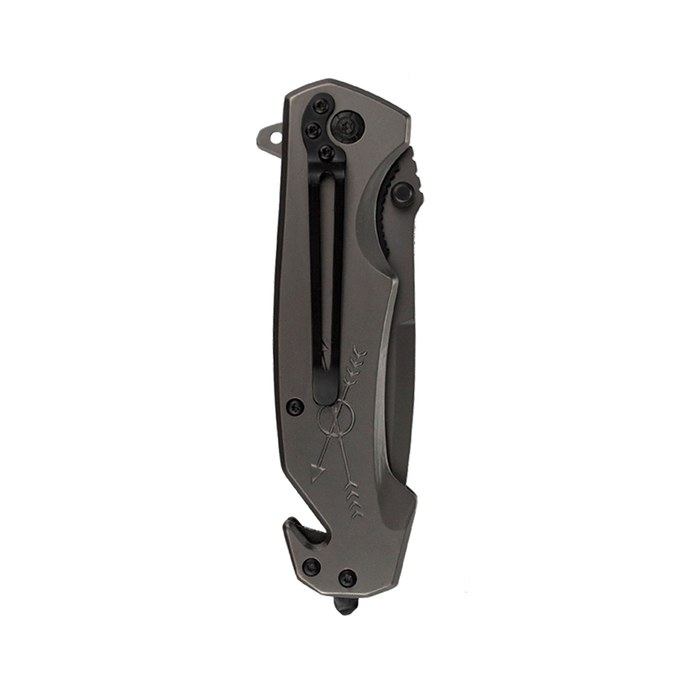 Canivete Tático na cor chumbo com Lâmina em aço no estilo Drop Point.
