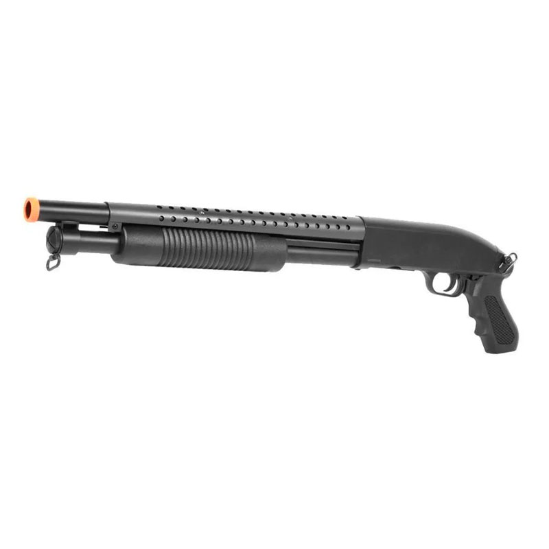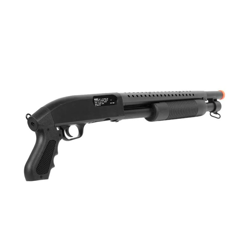 A shotgun de airsoft M58B da marca Double Eagle é a versão sem coronha da M58A e alia um baixo custo com uma ótima qualidade e acabamento. Arma de Airsoft perfeito para aquele jogo CQB. Possui sistema monotiro, ou seja, dispara apenas uma BBs por vez, com cerca de 295 fps com BBs 0,20gr. Shotgun basicamente em ABS, porem com partes em aluminio e hop up ajustável.
