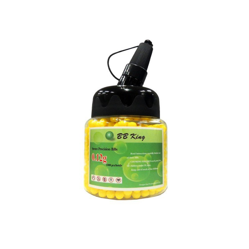 Esferas plásticas de alta precisão e polimento da BB King para equipamentos de airsoft calibre 6,0 mm. Embalagem com 1.000 unidades amarelas de peso 0,12g.