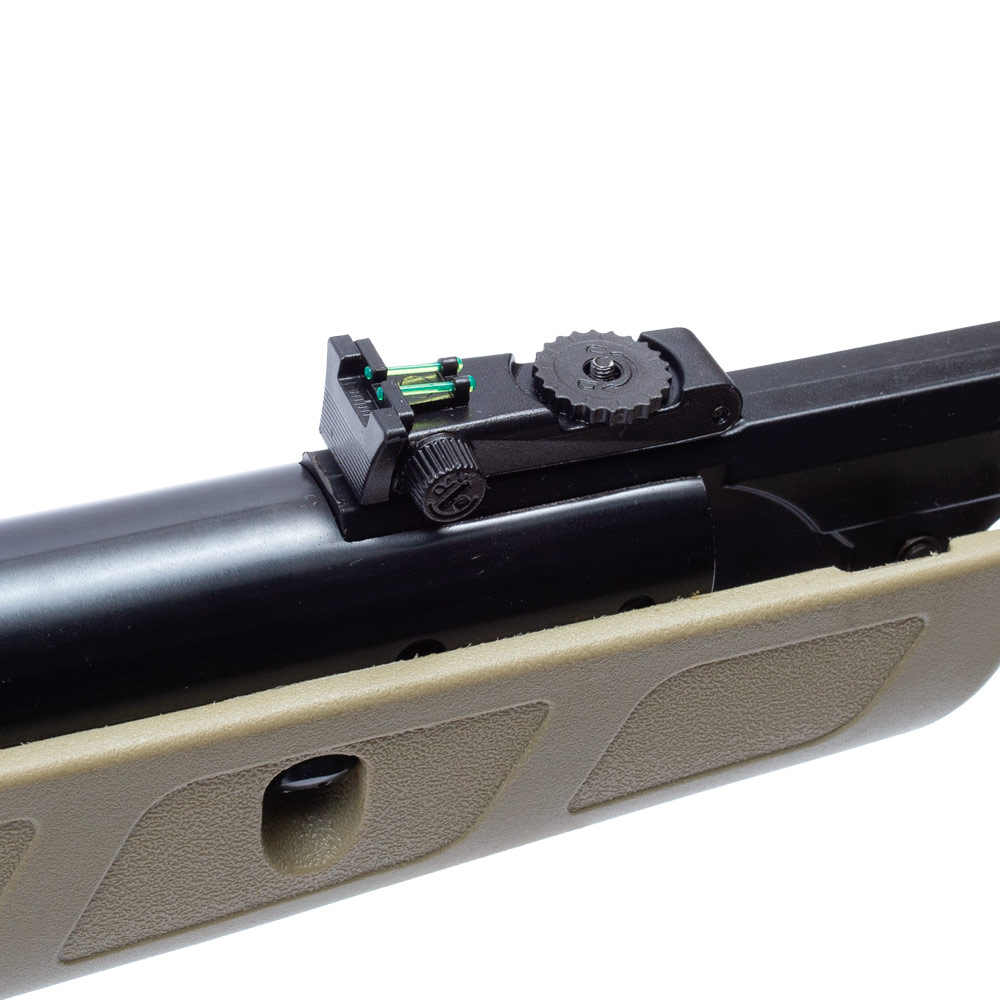 Com fibra óptica e alça de mira com regulagem micrométrica vertical e horizontal, massa de mira e túnel de proteção removíveis.