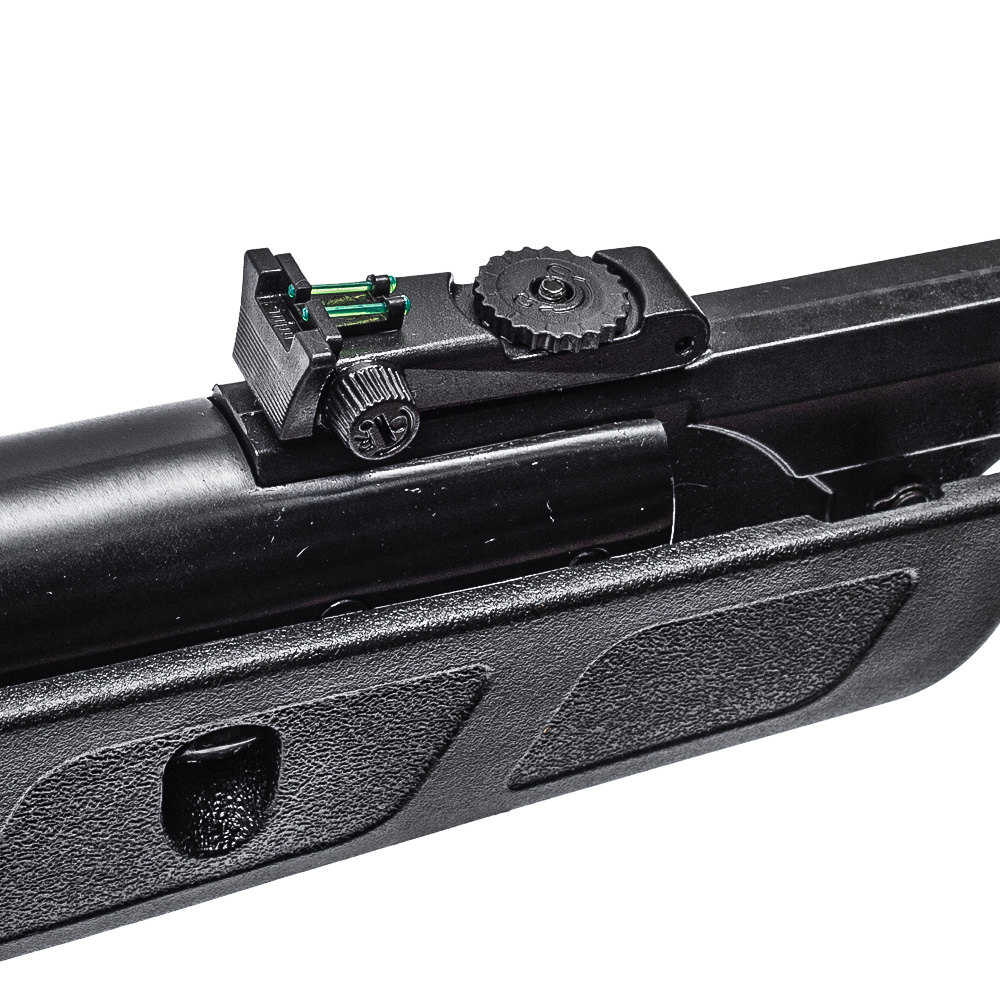 Possui sistema de segurança que impede o disparo com cano aberto, seu cano possui acabamento sobreinjetado que protege sua carabina contra a oxidação.