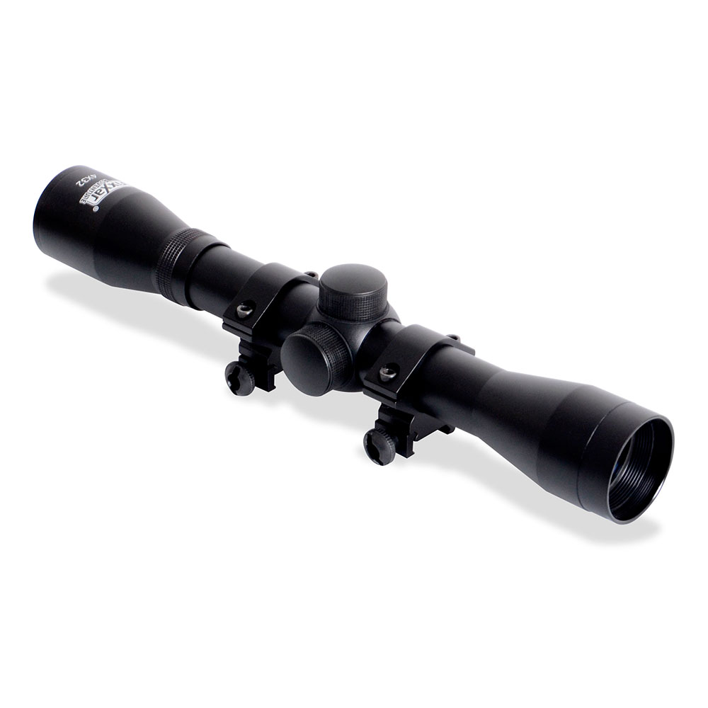 Possui suporte estilo "ring" reforçado e sistema de aperto "alen" para carabinas com trilhos de 11mm.