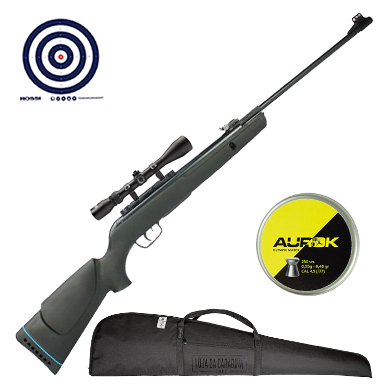 Combo criado pela LojaDaCarabina contendo Luneta 3-9x40 Rossi para melhor visada do alvo, Chumbinhos Aurok Olympic para municiar sua carabina, Capa LC para Carabina para que você possa armazenar e transportar sua carabina com segurança e Alvos de Treino Rossi.
