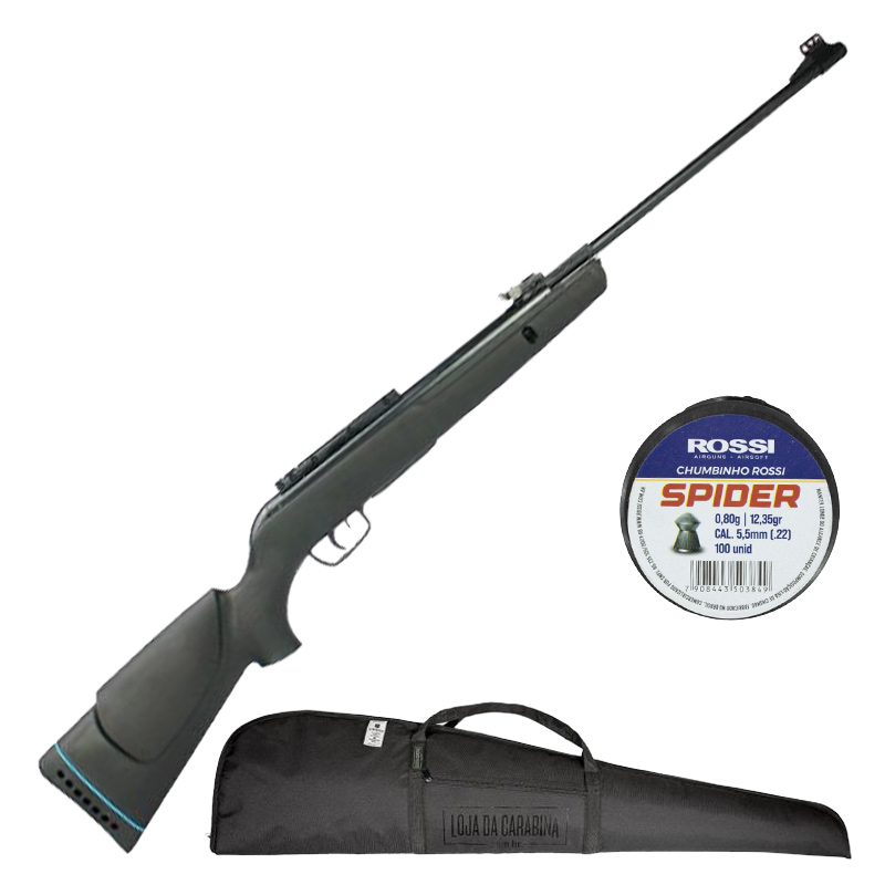 No KIT acompanha Capa para Carabina LC para transporte e armazenamento e Chumbinhos Rossi Spider pra municiar sua carabina.