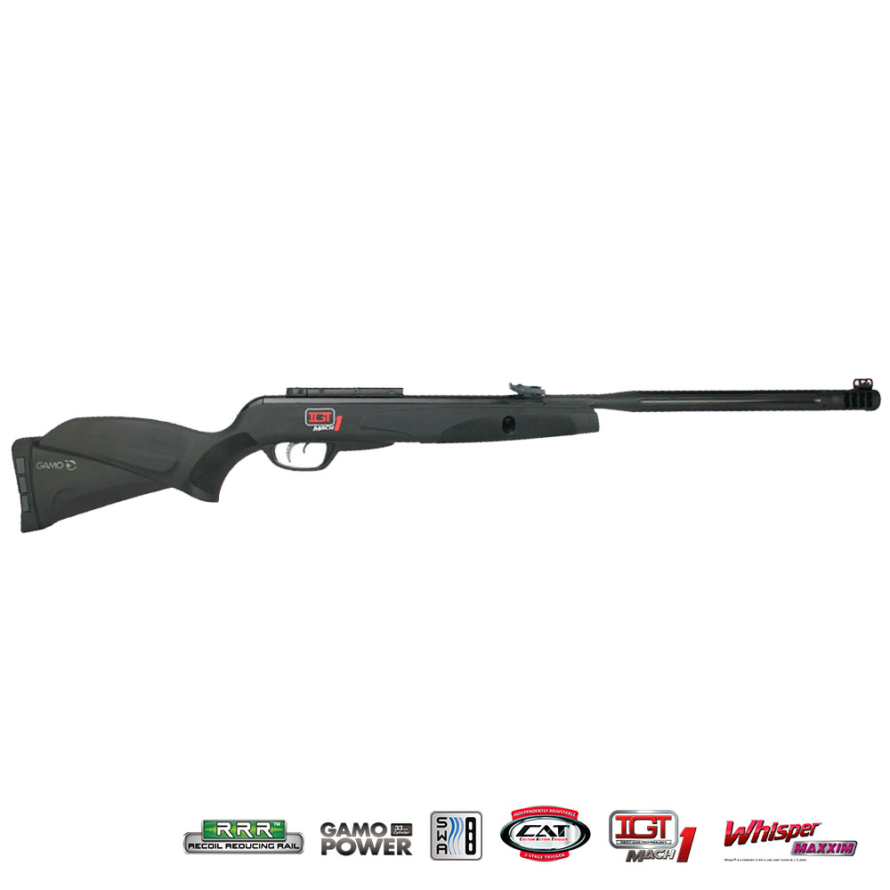 Carabina Gamo Black Maxxim Mach 1 com mola gás ram da família Gamo Power, projetada com coronha da Black 100 e equipada com as principais tecnologias Gamo como, cilindro de 33mm Gamo Power, Whisper Maxxim, gatilho CAT, soleira SWA e Trilho RRR.