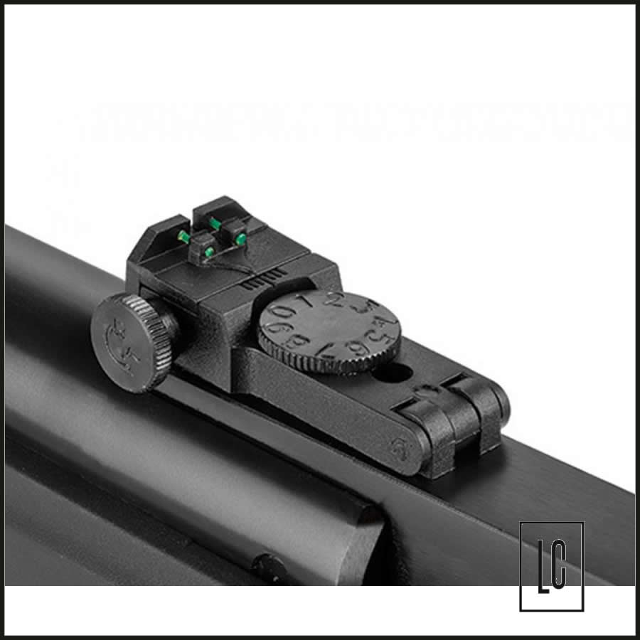 Alça de mira com ajuste vertical e horizontal.