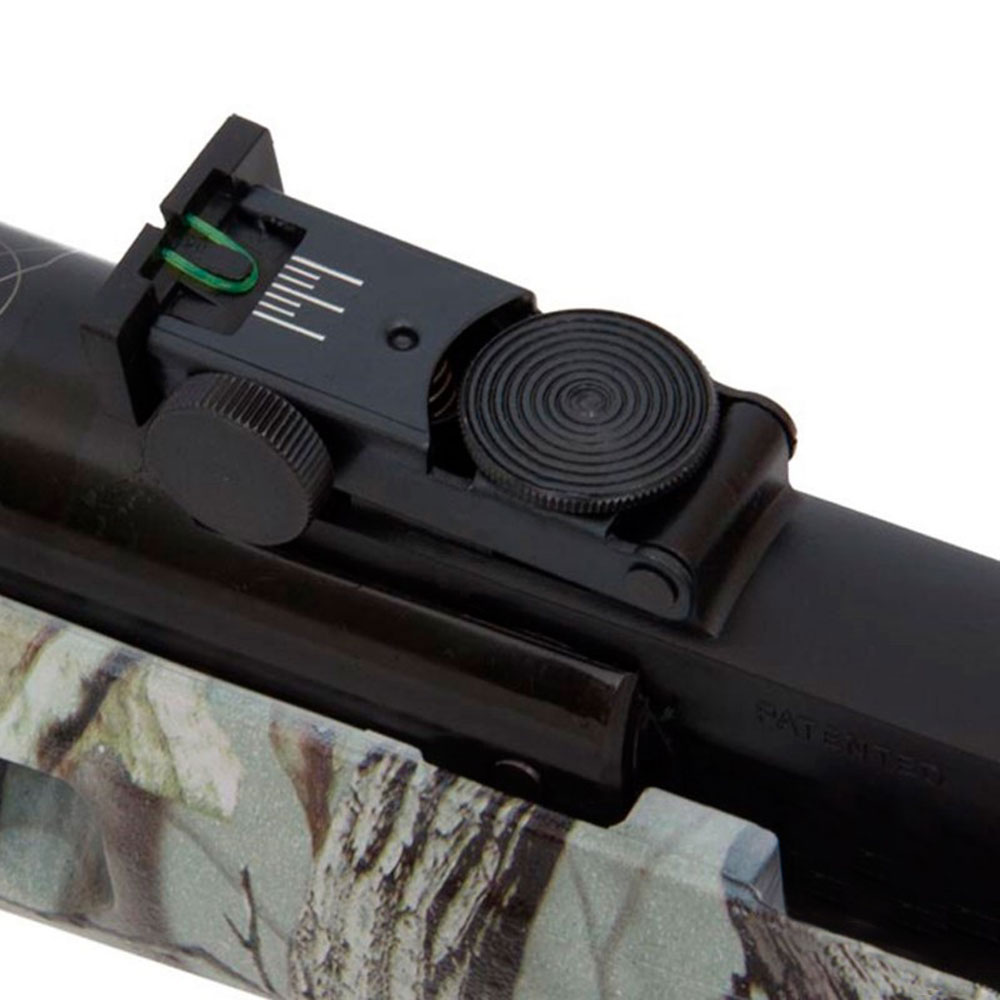 Com regulagem milimétrica vertical e horizontal na alça de mira com fibra de óptica verde e massa de mira com fibra óptica vermelha. Trilho elevado de 11mm em metal para fixação de acessórios.